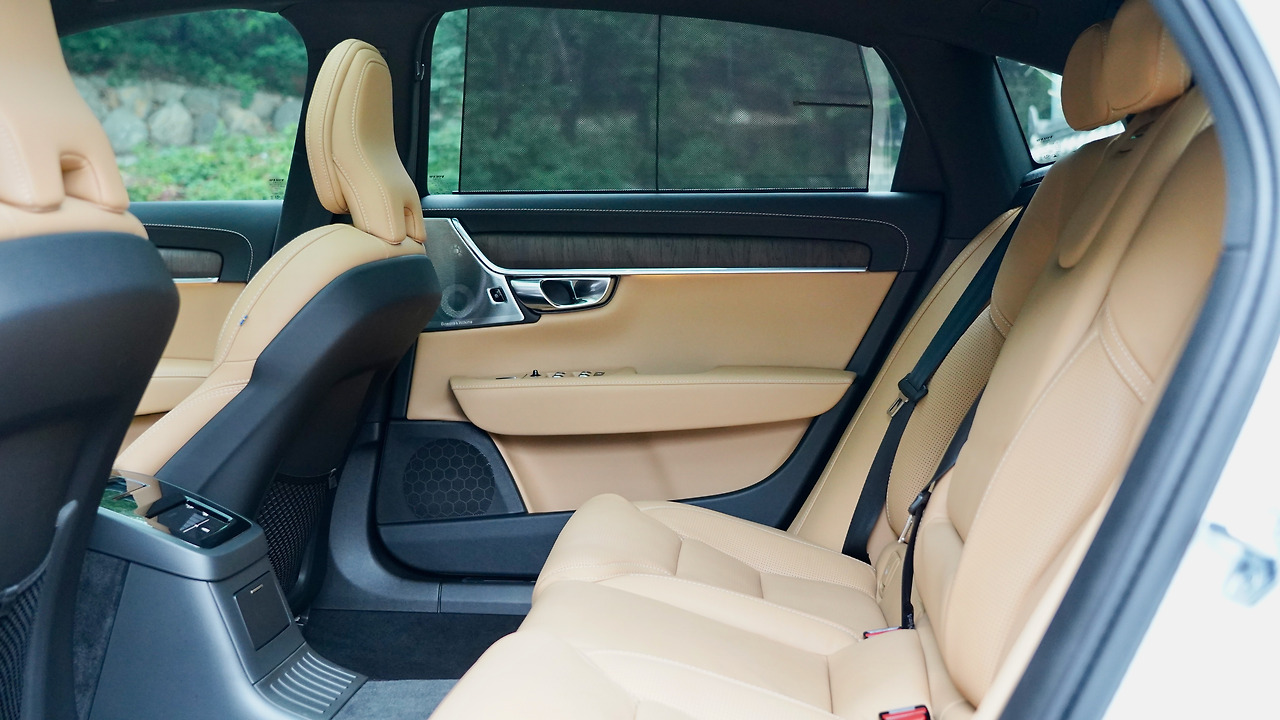그러고 남은 뒷좌석은 160cm대의 여성 두 명이 팔을 뻗어도 앞좌석 시트에 닿지 않을 정도다. 차체 길이를 5090mm로 늘린 롱휠베이스 모델인데 늘어난 차체 길이 대부분을 뒷좌석에 할애했다. S90의 뒷좌석은 동급 수입차 가운데 특출나게 넓다.