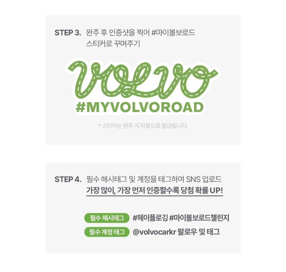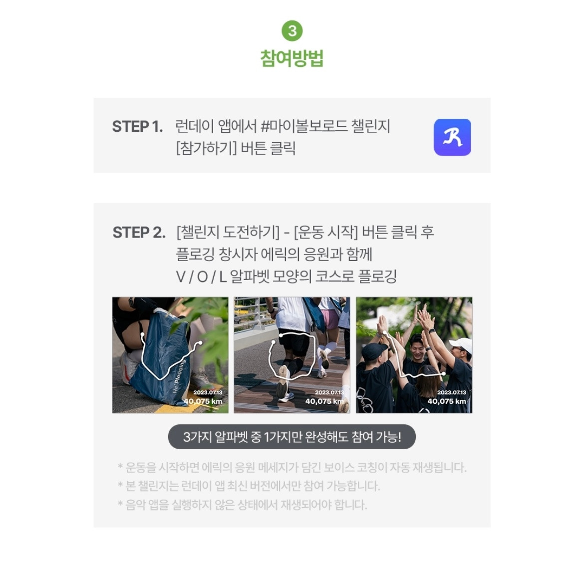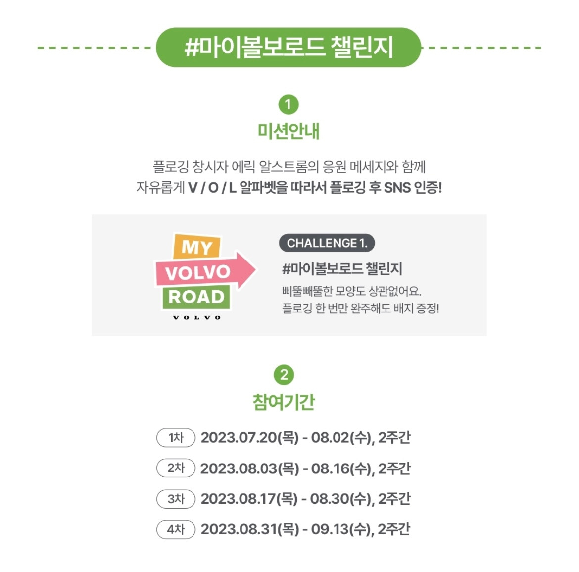 개인 챌린지인 ‘#마이볼보로드 챌린지’는 플로깅의 창시자 에릭 알스트롬의 응원 메시지와 함께 V/O/L 알파벳을 따라 플로깅을 진행하게 되는데요.