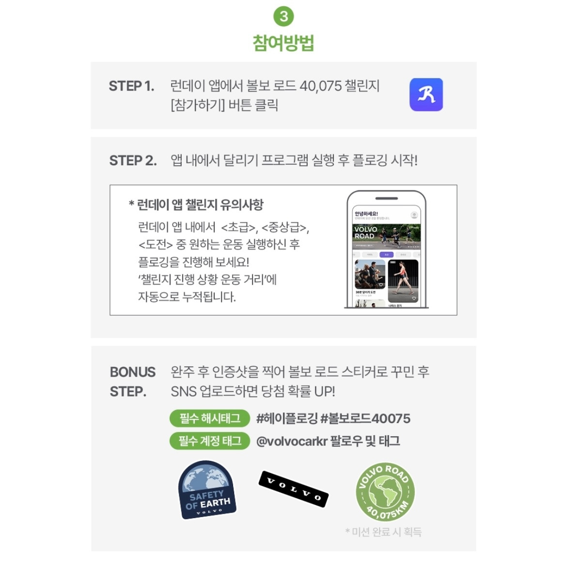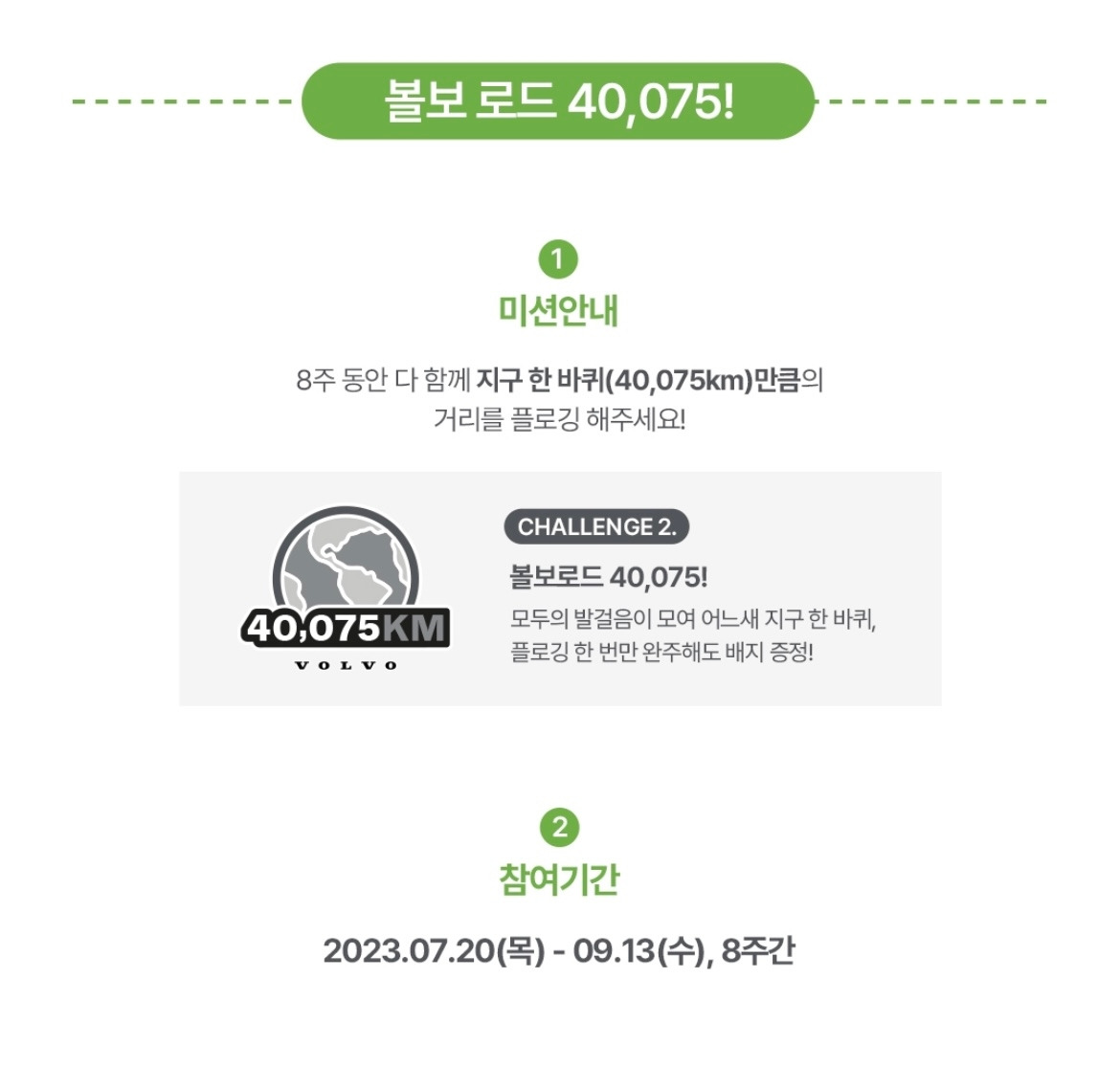 여기에 참가자 전원이 플로깅으로 지구 한 바퀴 거리(40,075km)를 달성하는 단체 챌린지인 ‘볼보 로드 40,075!’도 있습니다.