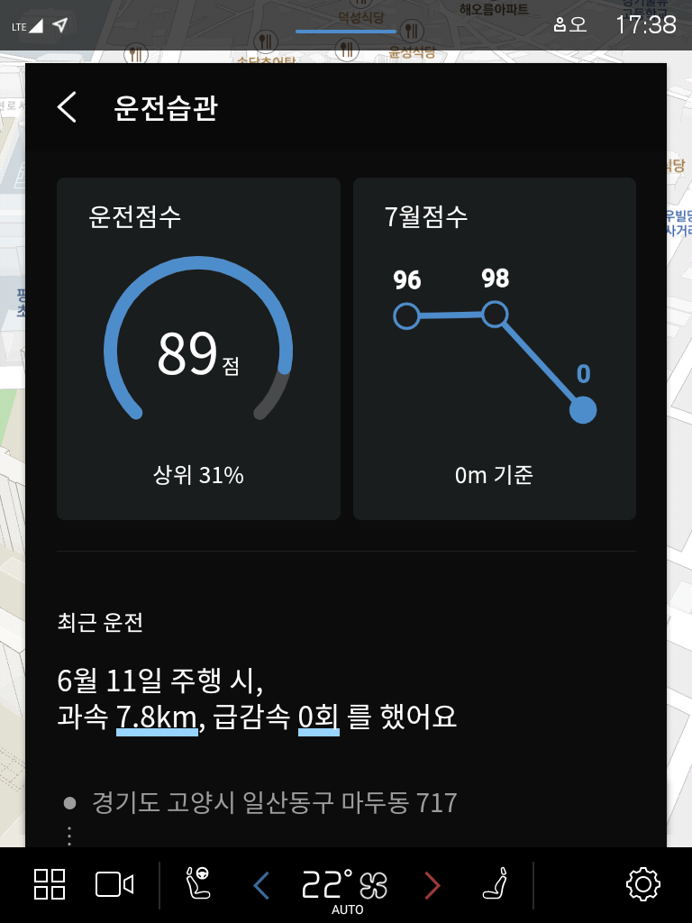 운전자의 주행 이력을 파악해 운전 점수를 매기는 ‘티맵 운전습관’ 점수도 차량 내 인포테인먼트를 통해 바로 확인할 수 있어요. 티맵 운전점수를 일정 이상으로 유지하면 보험료 할인 혜택을 받을 수 있다는 점도 기억해주세요!