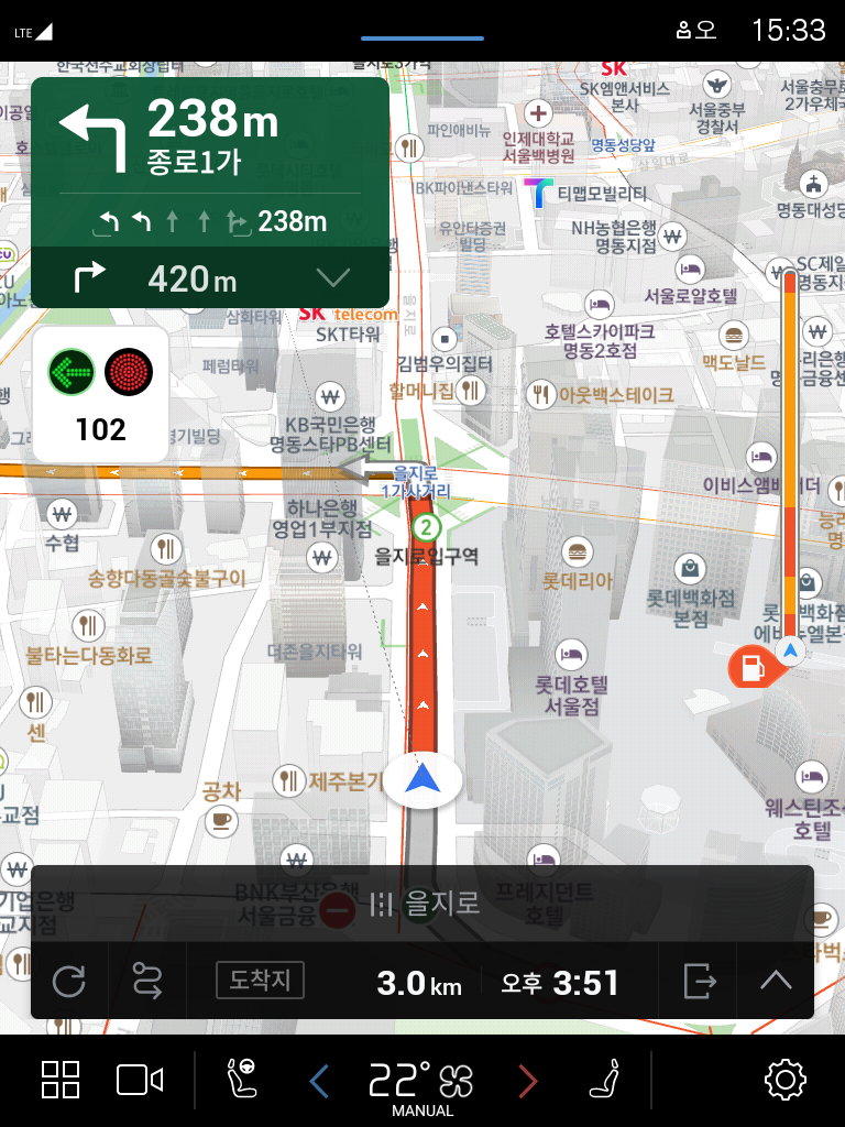 이외에도 티맵 인포테인먼트 서비스 2.0은 서울시 차세대 지능형 교통 시스템(C-ITS)을 기반으로, 실시간 신호 정보와 잔여 신호 시간, 적정 교차로 통과 속도 등을 확인할 수 있는 커넥티드 드라이빙 서비스를 지원합니다.