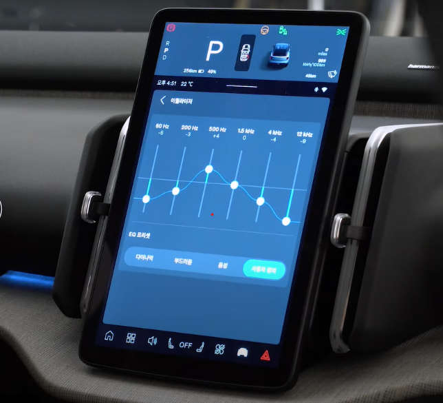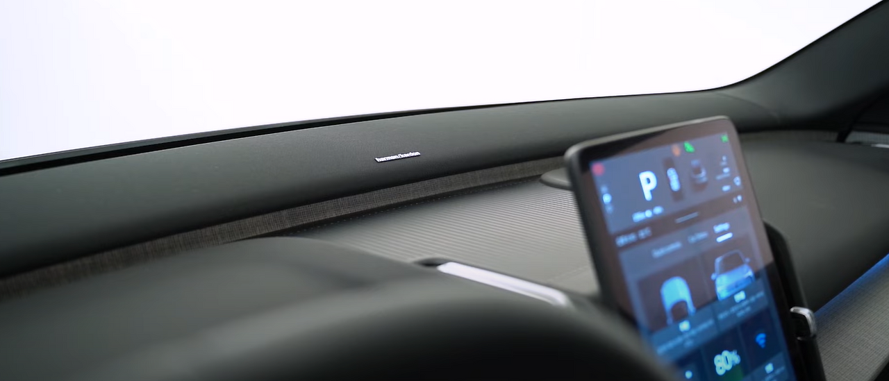 볼보 EX30의 사운드는 미니멀한 하만 카돈 사운드바가 책임진다. 사운드바 가운데에는 80mm 미드 트위터, 100mm 중음역 트위터 두 개와 19mm 고음역 트위터 두 개가 들어있다. 총 다섯 개의 스피커 유닛이 저 담백한 디자인 안에 숨어있다는 뜻이다.
