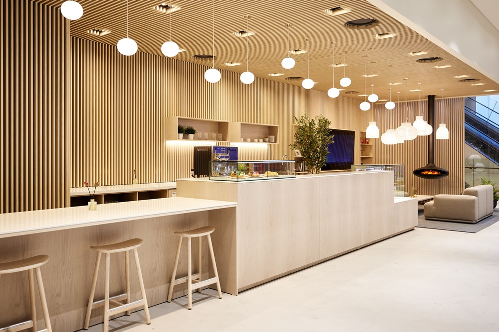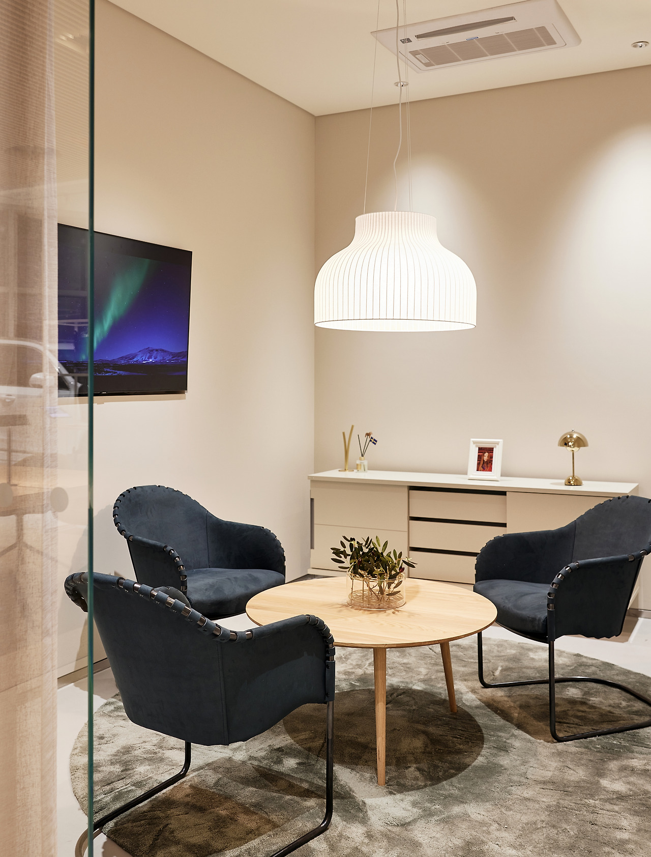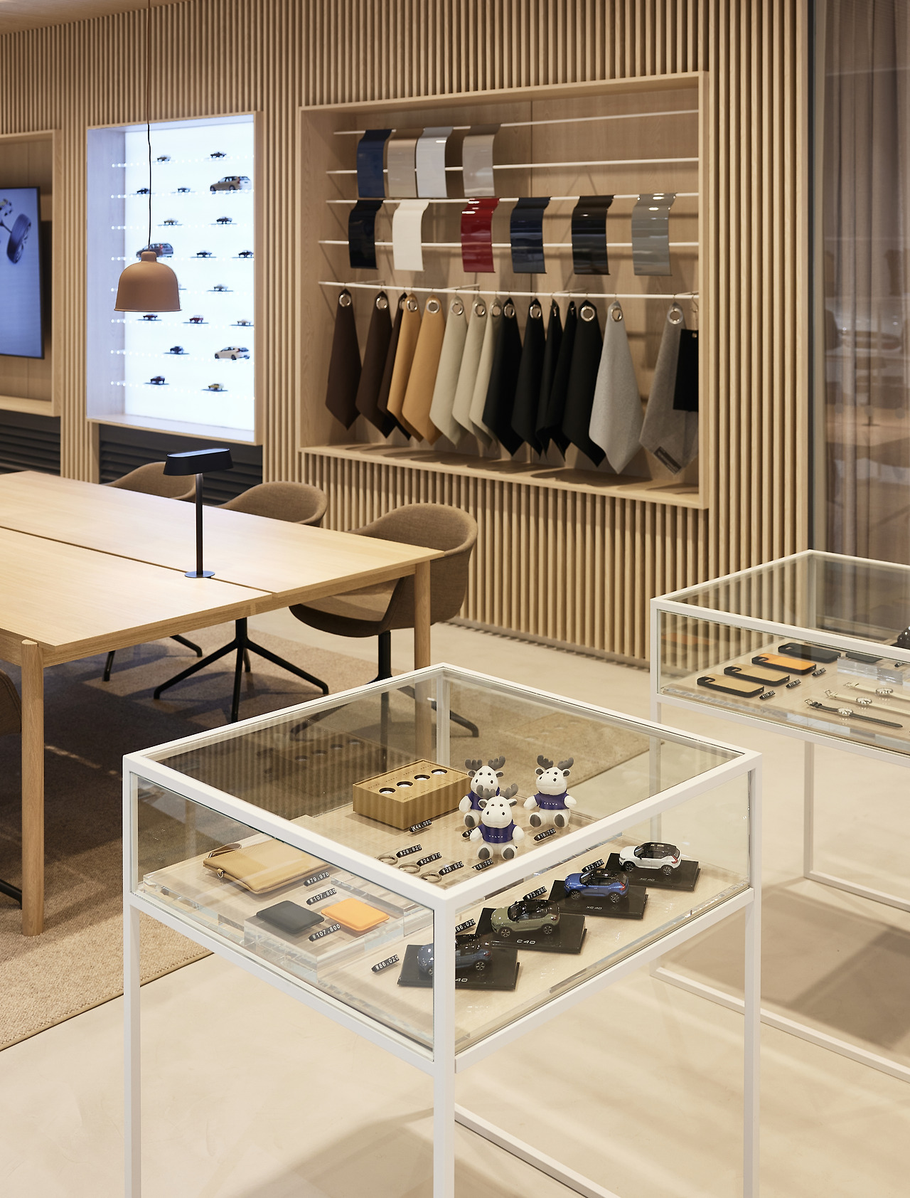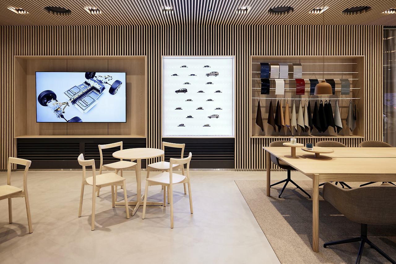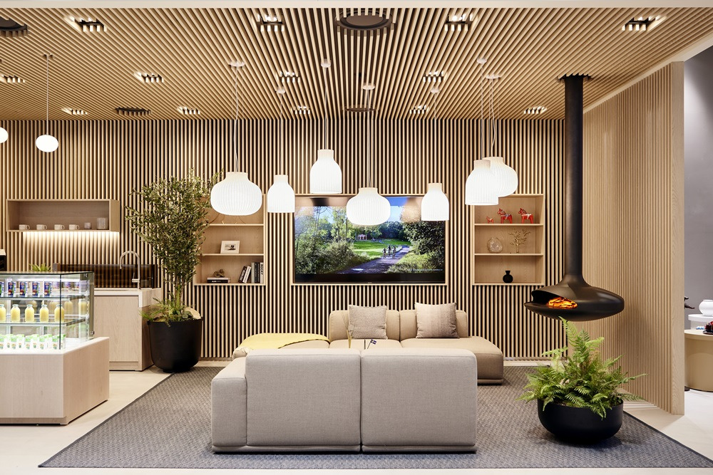 전시장 밖에서부터 느껴지는 북유럽 감성의 인테리어도 빠질 수 없는 구경거리인데요. 친환경 컨셉과 지속가능성 가치를 구현한 전시장 내부는 마치 스웨덴의 가정집을 연상케 하는 스칸디나비아 개방형 공간으로 꾸며졌습니다. 고객 라운지 및 상담 공간에 쓰인 북유럽 조명과 애쉬우드 마감은 친환경 자재로 모두 스웨덴에서 직수입한 소재를 활용했습니다.