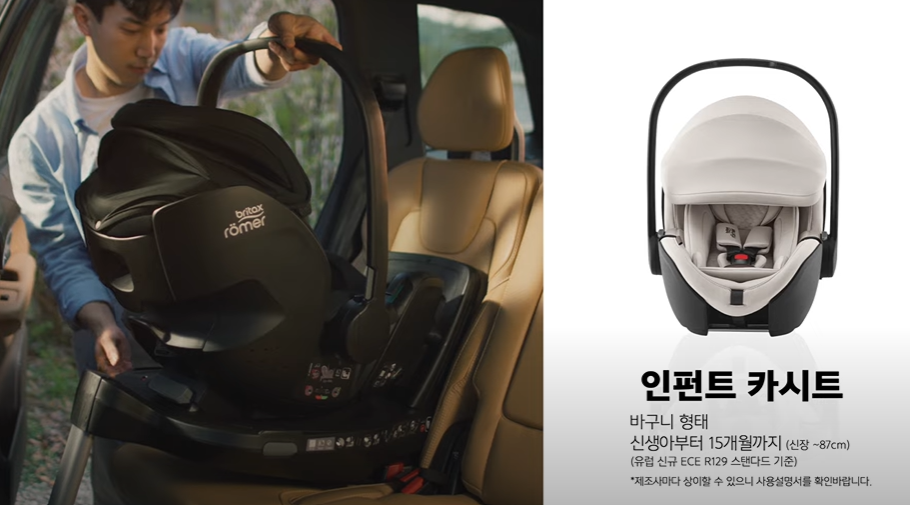 신생아부터 15개월까지(신장 ~87cm)는 바구니 형태의 인펀트 카시트를 설치해 운전석 반대방향을 바라볼 수 있도록 해야 합니다. 머리와 목이 연약한 아이들이 충격을 분산하여 흡수할 수 있어야 하기 때문이죠.