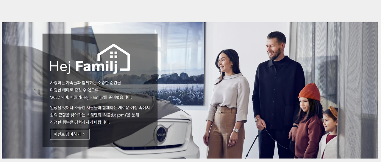 볼보 라이프스타일 숍은 브랜드 공식 굿즈를 만나볼 수 있는 동시에 다양한 고객 이벤트에 참여할 수 있는 공간입니다. 현재 홈페이지에서는 ‘2022 헤이, 파밀리(2022 HEJ, FAMILJ)’ 모집이 진행되고 있는데요, ‘헤이, 파밀리’는 자사 오너 가족을 대상으로 한 스웨디시 라이프스타일 체험 프로그램으로 스스로와 가족에게 집중하고 자연과 더불어 살아가는 스웨디시 라이프를 제안하고자 2018년부터 진행해 온 고객 이벤트입니다. 2020년부터는 코로나19 확산 방지를 위해 참가자들이 개별 일정을 즐기는 방식으로 운영되고 있지만, 이전에는 모든 참가자가 한 자리에 모여 즐거운 저녁 파티를 하기도 했죠.