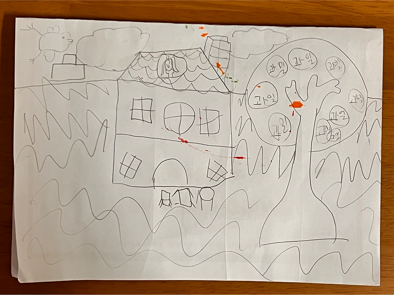 바빠서 대충 훑어보았던 아이의 그림이 정말 오늘 보고 온 집과 비슷했다. 벽돌로 지어진 지붕을 가진 2층 집, 3층의 다락방, 과일나무가 있는 잔디마당과 울타리, 마당에 날아다니던 새 그림까지. 아이에게 사진을 보여주니 정말 자기 그림이랑 똑같다, 자기가 좋아하는 것을 모두 갖췄다며 신나서 방방 뛰었다.