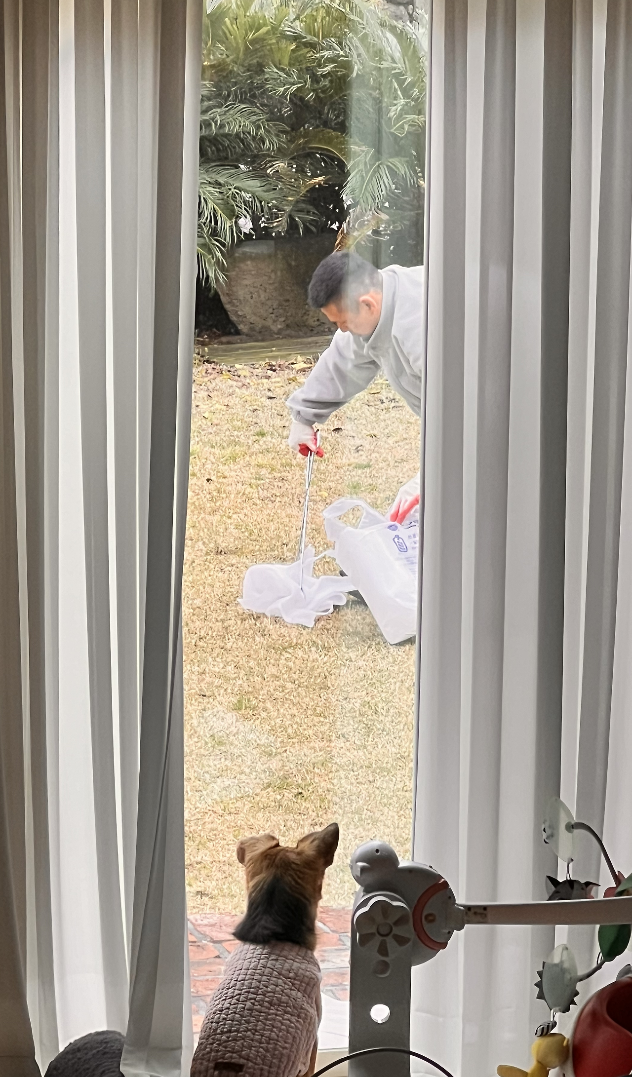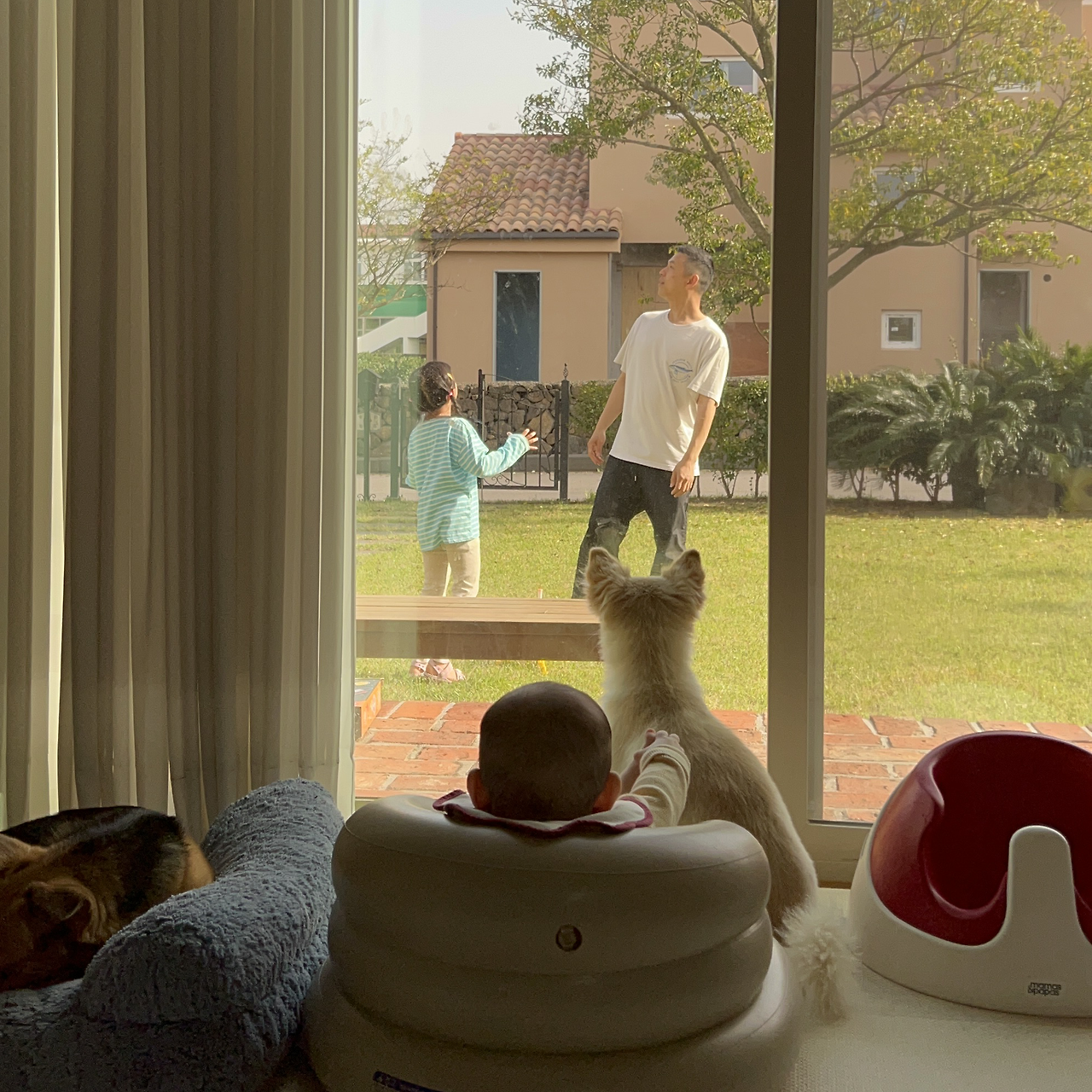 집에서 입고 있던 옷 그대로 아기를 안고 햇볕을 쐬러 나와 마당에 앉아있기도 하고, 개들과 창가에 나란히 앉아서 바깥구경을 하기도 한다.