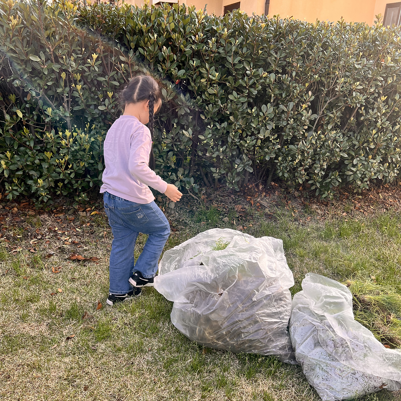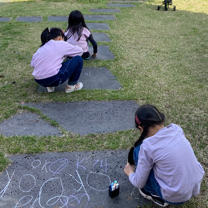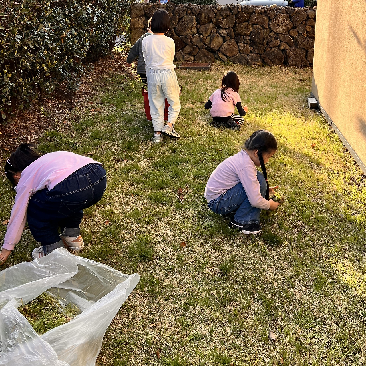 지난주에 친구 집에 초대받은 아이를 데리러 갔는데 저녁 해가 어스름히 지는 마당에 비친 아이들이 얼마나 평화롭고 아름답던지! 분필로 땅에 사방치기를 그리고, 잡초를 뽑는 것도 놀이가 되어 신나게 바구니를 나르고 잡초를 뽑고 역할놀이를 한다.