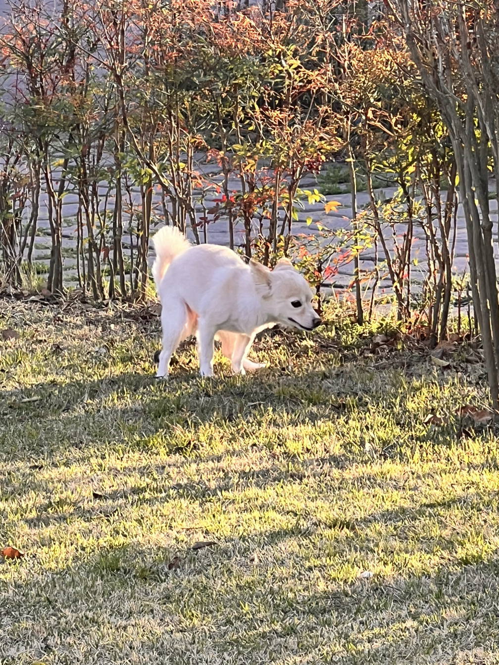 아침에 일어나면 콩이가 중문 앞에 코를 박고 꼬리를 흔들며 기다리고 있다. 현관문을 열어주면 바로 뛰어나가 쉬와 응가를 해결한다. 배변이 1분 컷이라니 감동의 시간 단축이다.