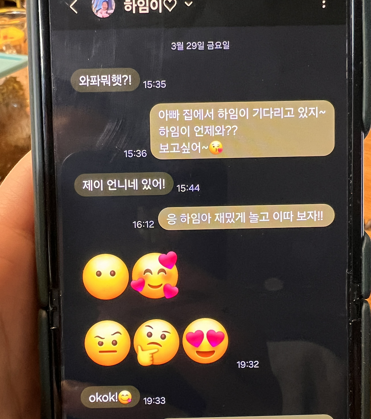 자기가 만든 장난식의 말투가 재밌는지 혼자 큭큭 웃기도 하고, 물음표도 넣고 느낌표도 넣고 하니 고작 네 글자 입력 하는데 한참이 걸린다. 알파 세대의 독수리 타법.