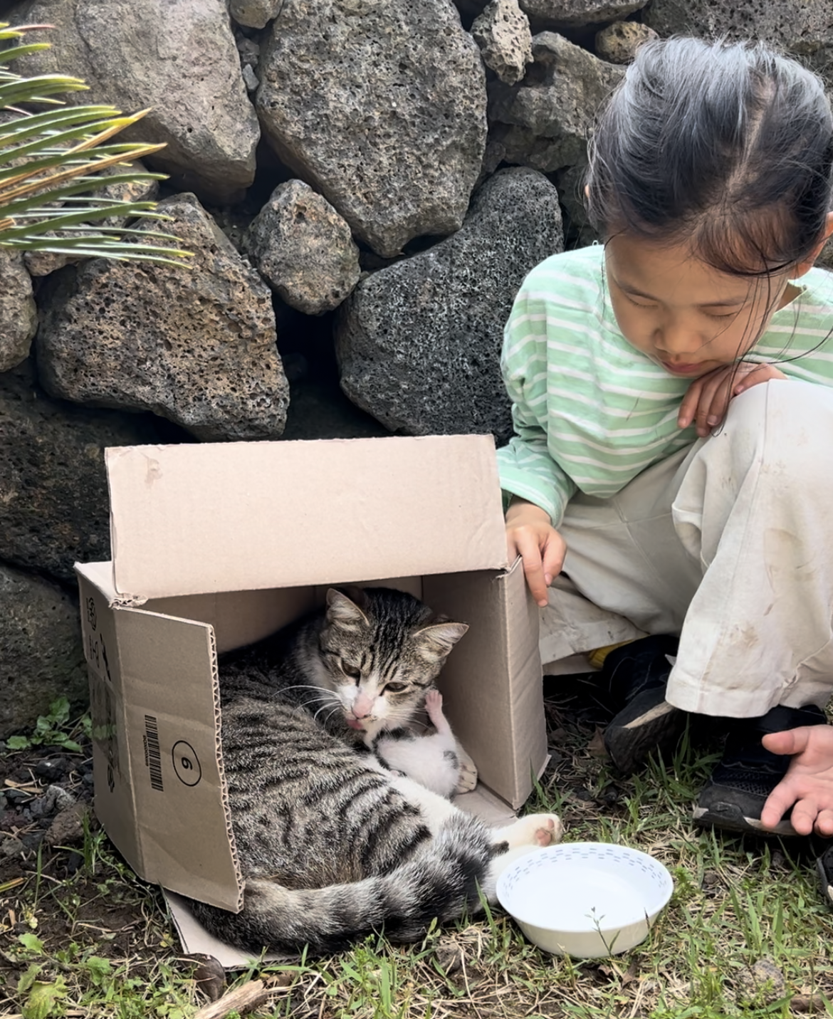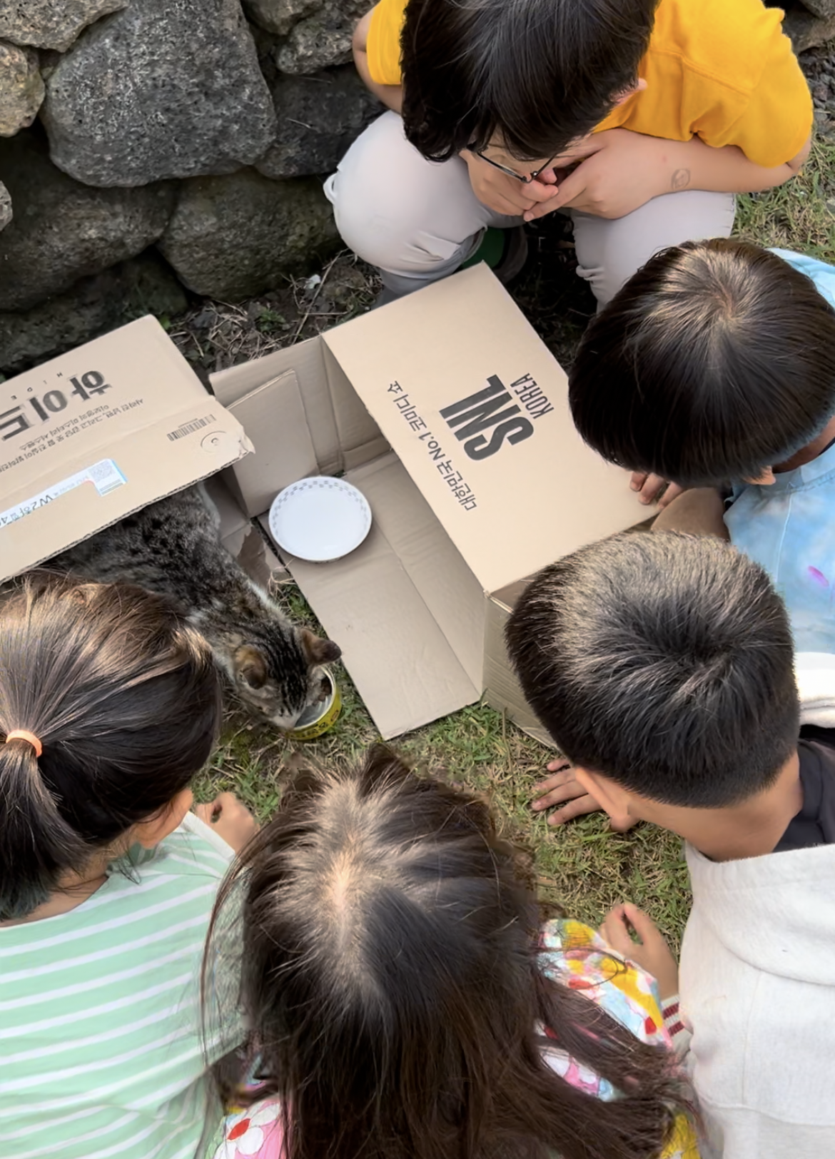고양이는 걱정이 무색하게 경계는커녕 아이들에게 둥글게 둘러싸여 있는데도 편안하게 젖을 먹이면서 참치캔과 사료를 오독오독 씹어 먹는다.