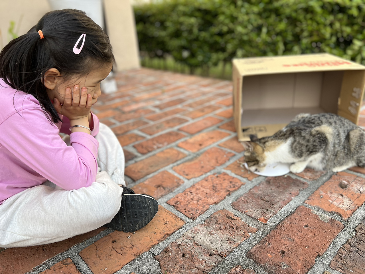 아이들은 알았다고 하면서도 궁금해서 자꾸만 자꾸만 다가가고, 고양이는 슬그머니 마당 쪽으로 이동한다. 동물이라면 사족을 못쓰는 하임이도 눈을 떼지 못하고 홀린 듯이 다시 친구네 마당으로 들어간다. 대문 앞에 서서 조금 기다려보지만 역시나 선뜻 올리가 없다. 다시 들어가 보니 마당 한쪽에 아이들이 쪼그려 앉아있고 그 앞에는 작은 박스 안에 몸을 누이고 있는 고양이가 있다.