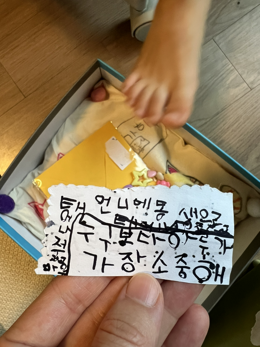 엄마, 아까 우리가 아기 천사한테 답장 쓴 거 가져갔을까?