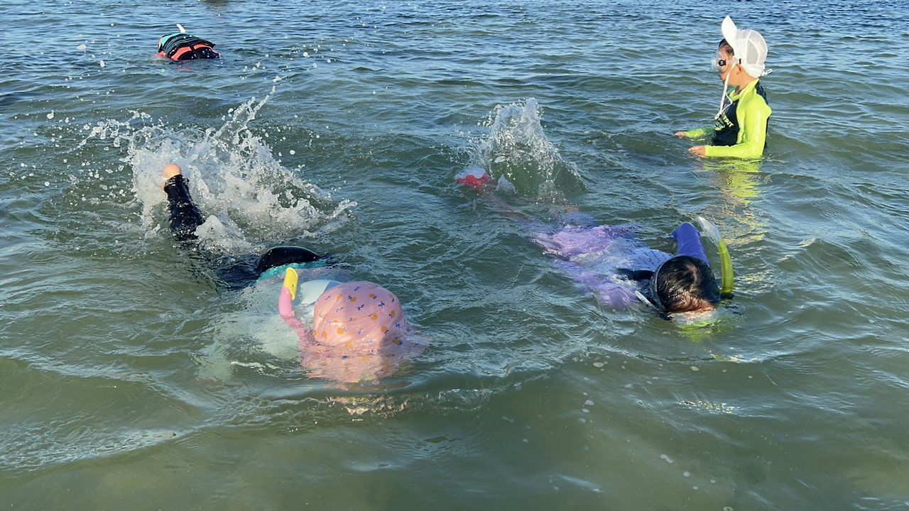 첫째의 손을 잡고 엎드리는 순간 몸이 두둥실 파도에 휩쓸리며 바닷속 풍경이 눈앞에 펼쳐진다.