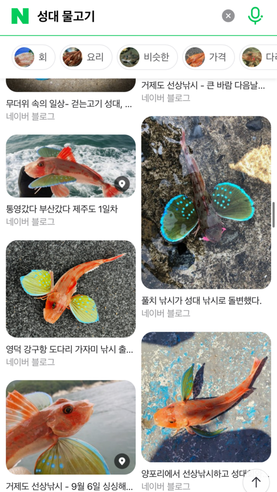 한참 물속 세상을 구경하고 다시 모래사장으로 나가던 길, 나비 날개처럼 커다랗고 파란색 지느러미를 가진 물고기를 발견했는데 그동안 보던 물고기의 색과는 다르게 형광에 가까운 파란색 지느러미라 더욱 묘한 느낌이 들게 했다. 나중에 돌아와 찾아보니 [성대물고기]라는 종이라고 한다.