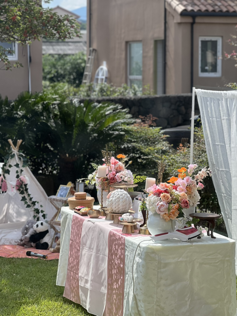 파란 하늘 아래 따뜻한 햇살이 비추는 아기자기 꾸며진 돌상을 보니 더 설레었다. 둘째도 그날따라 밥도 잘 먹고 낮잠도 제시간에 맞춰 잠들고 일어났다.