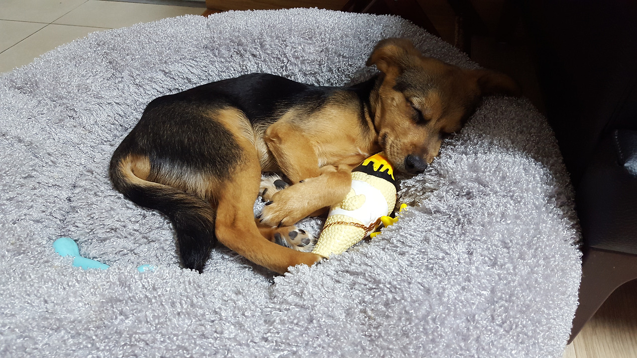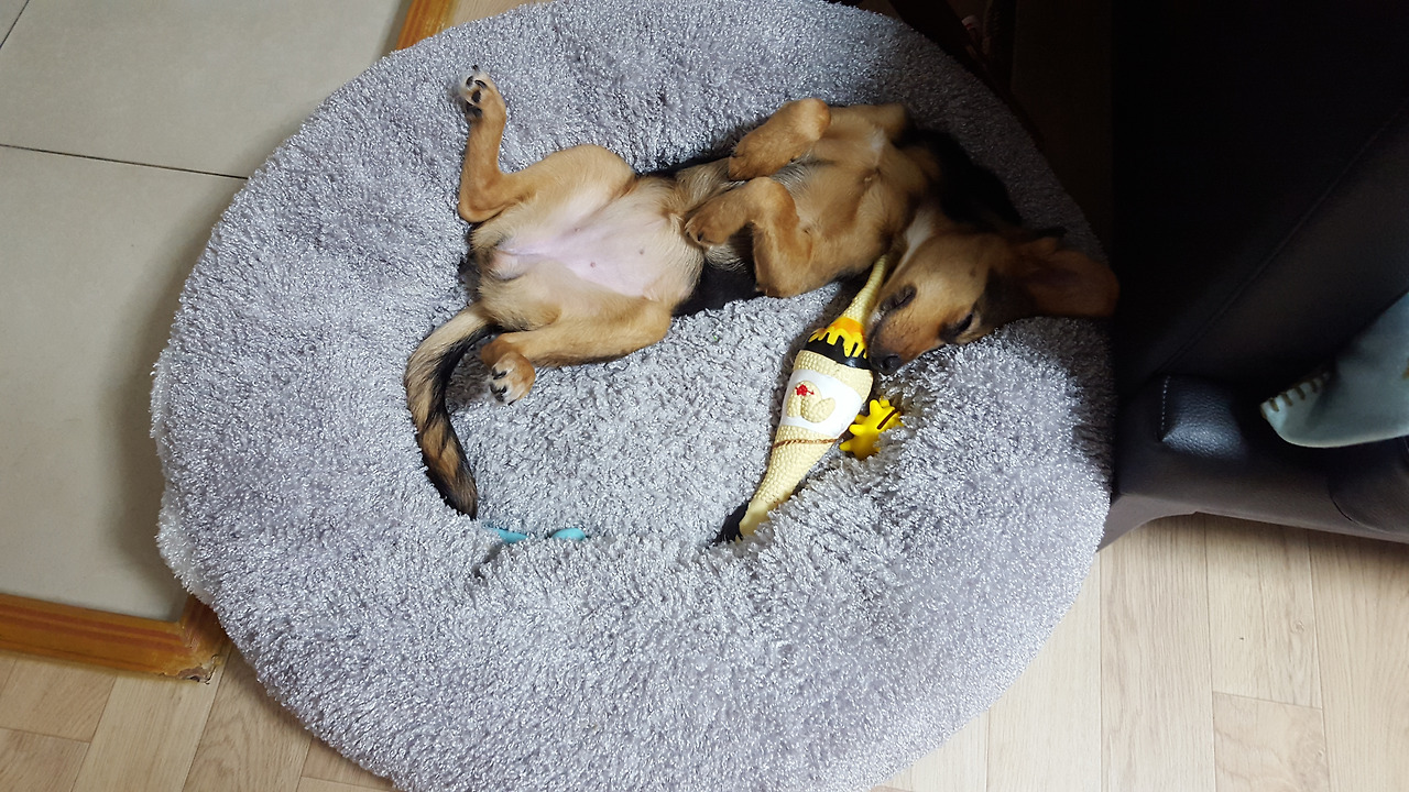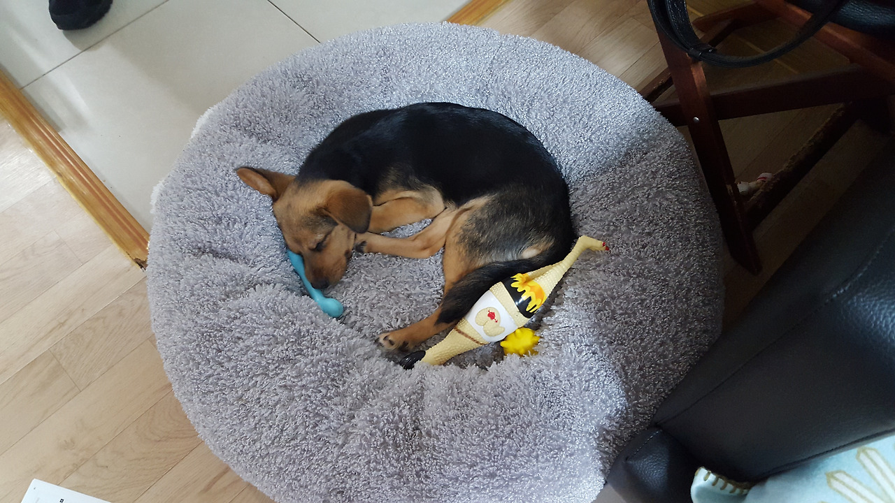 집에 들어서자 보리는 우리를 반기다말고 품에 안겨있는 델핀이를 보고는 당황한듯했다. 조심스럽게 델핀이를 내려주자 킁킁 냄새를 맡으며 천천히 돌아다니다가 한 자리에 엎드렸다. 보리는 앉아있는 델핀이를 향해 이리저리 뛰어다니며 왕왕 짖어댔다. 다행히 델핀이는 보리가 짖던말던 귀만 뒤로 제낀채 가만히 앉아있더니 보리의 신고식이 끝나자 마약방석에 장난감을 물고와 깨물깨물하다가 금방 잠이 들었다.