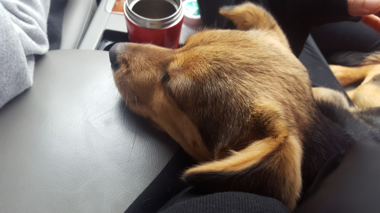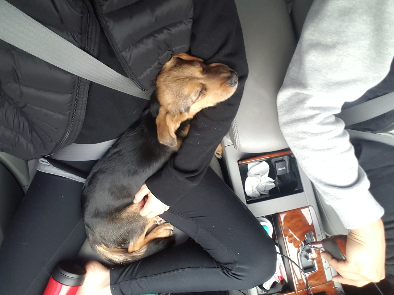 차를 타고 내 무릎에 델핀이를 태웠다. 델핀이는 차에 탄지 얼마되지않아 내 무릎에 기대어 잠이 들었고 집에 도착할때까지 한번도 깨지않았다.
