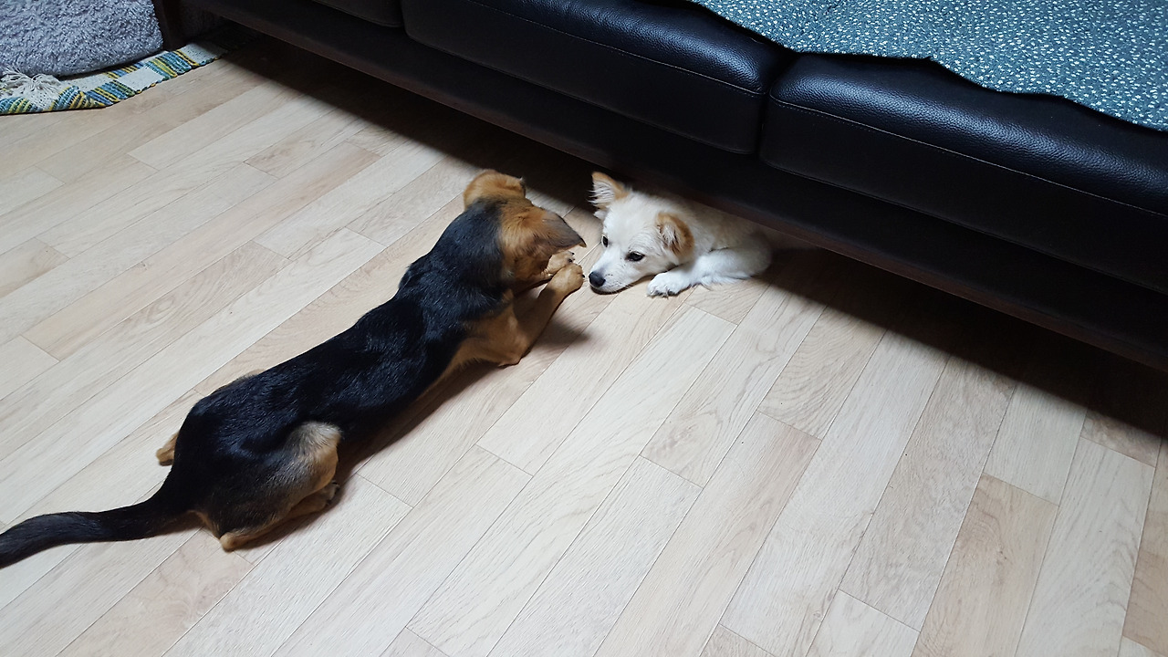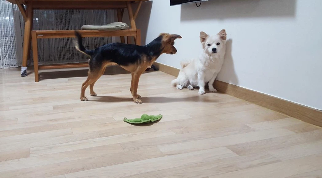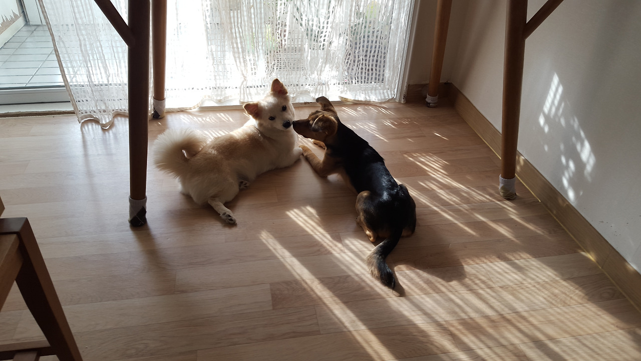 아무래도 콩이의 임시보호를 시작하면서 가장 걱정했던 건 둘이 잘 지낼 수 있을까였다. 다행히도 보리와 콩이는 개린이들답게 신나게 뛰어놀고, 가끔은 투닥거리기도 하며 잘 지내는 듯했다.
