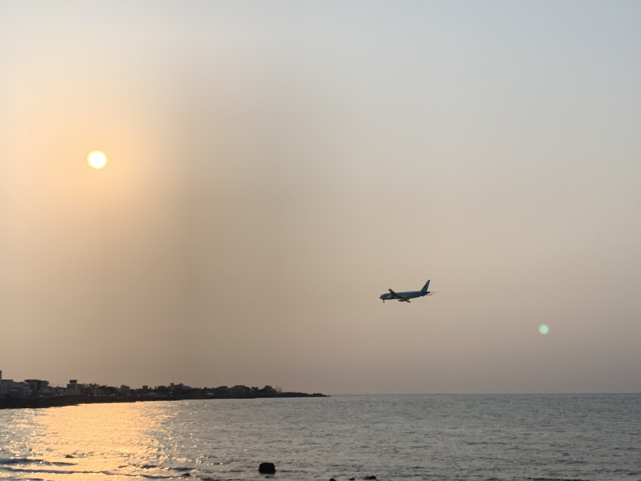 #저녁 먹기 전에 잠깐 바닷가에 앉아서 비행기 바라보기