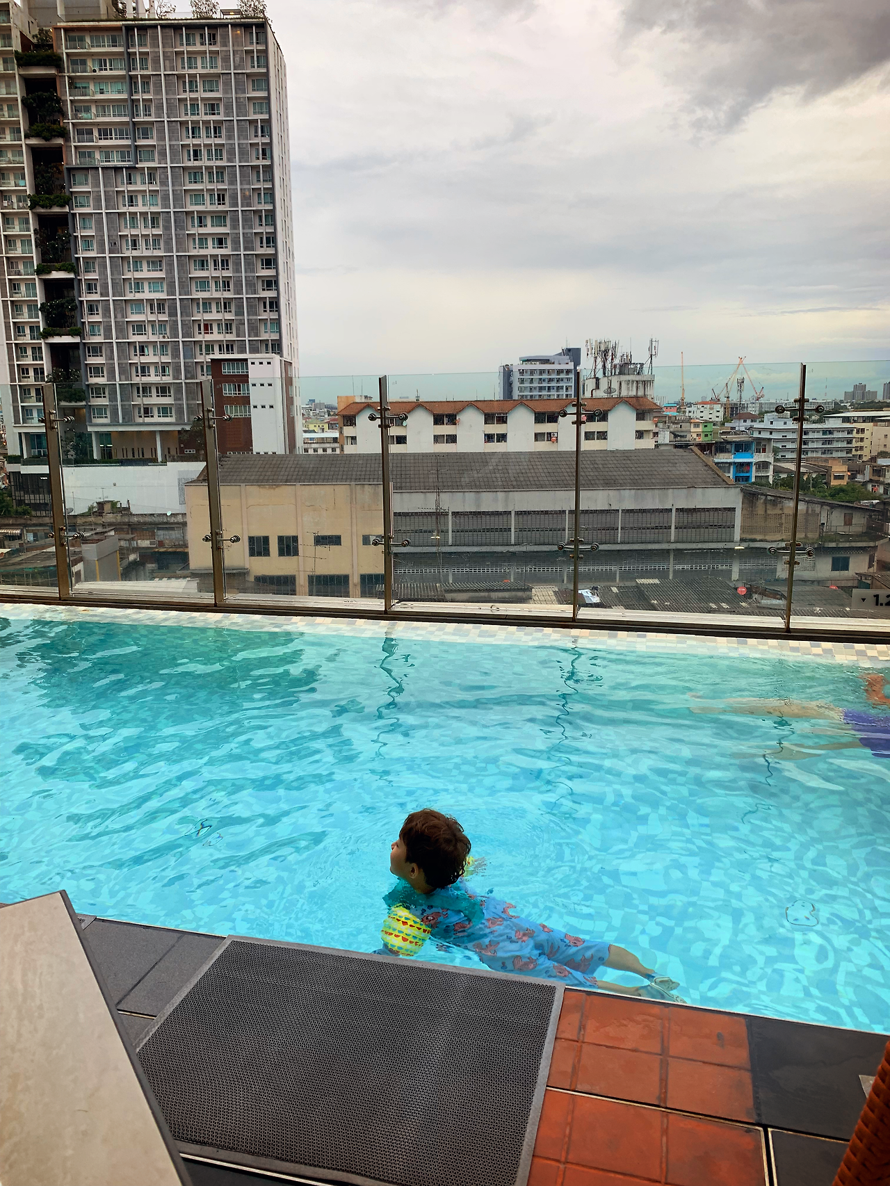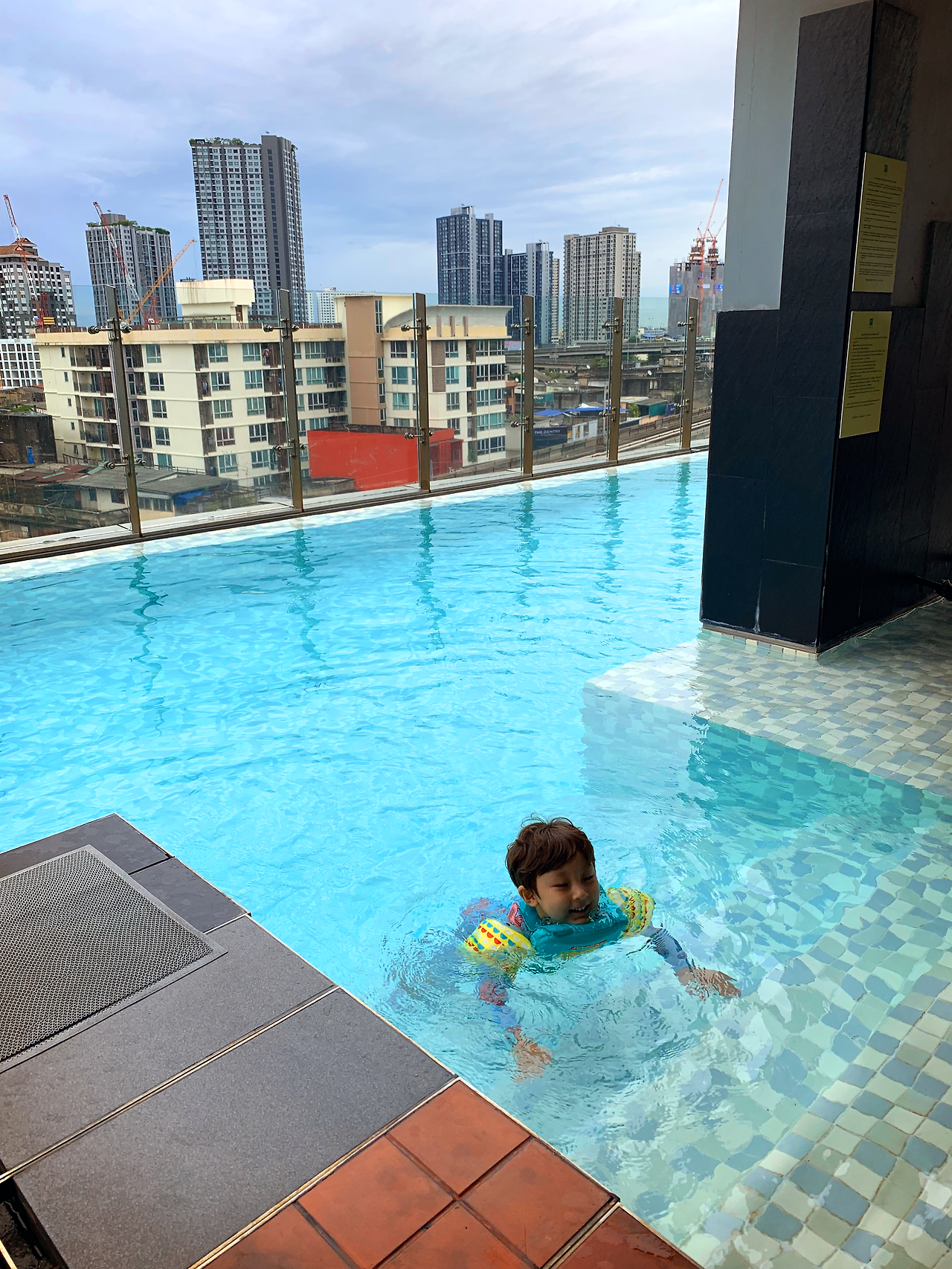쉴 것 같더니만 또 수영장을 간다기에 갈아입혀서 수영장에 내려왔어요.