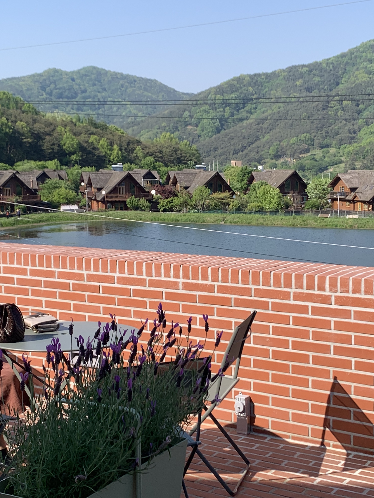 유럽 느낌이 물씬 나는 타일에 저수지가 보이는 뷰