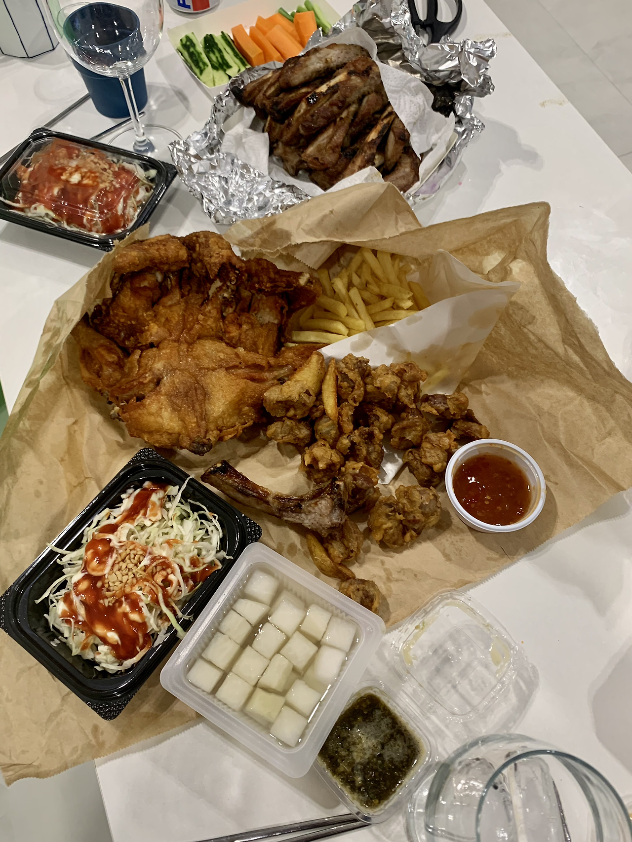 결혼식의 뒤풀이로 친구의 치킨가게에 왔어요.
