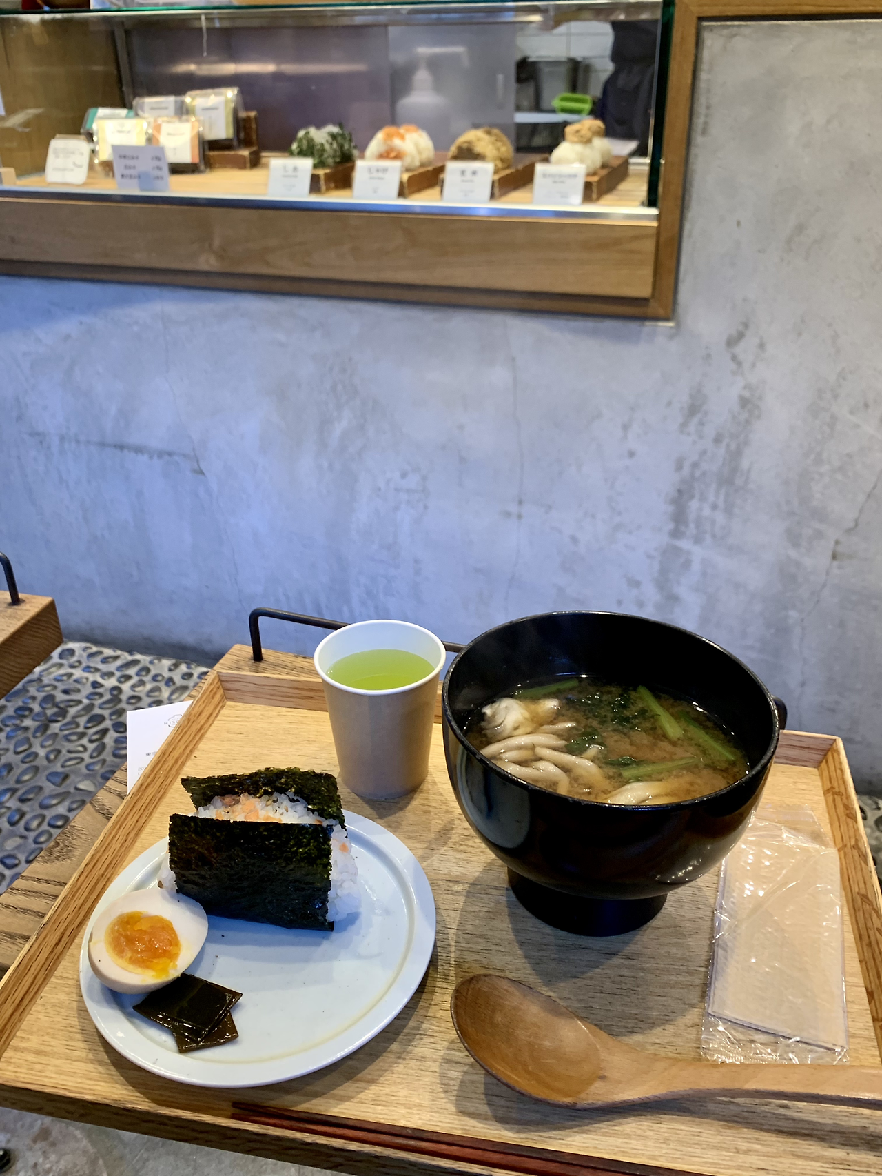오니기리 한 가지를 선택하고 수프도 두 가지 중에 고르는 아침메뉴랄 선택하니 달걀도 나오고 녹차도 제공이 돼요.