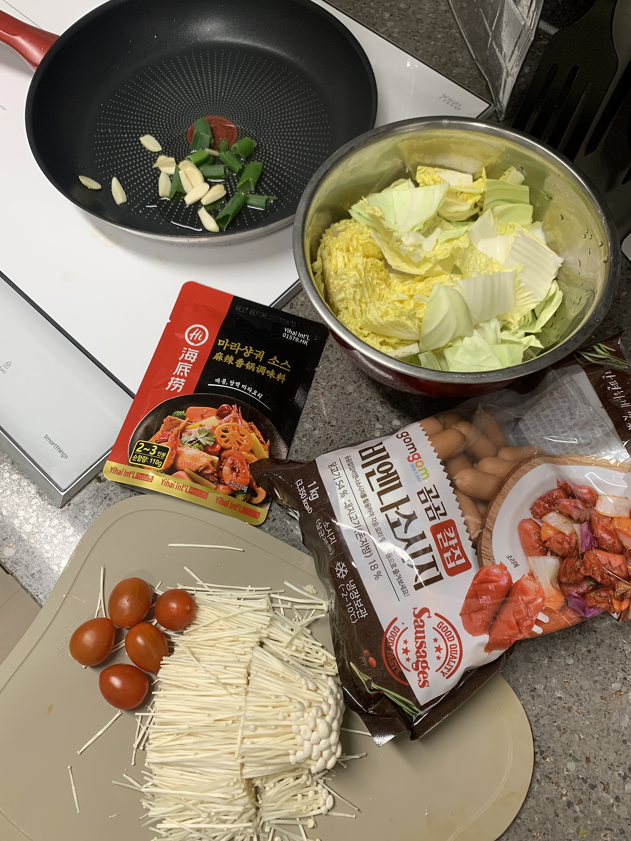 일본음식에... 물려서는 한국에서의 저녁은 냉털로 나아있는 야채와 소시지와 냉동우삼겹을 넣고 마라샹궈 후루룩 만들어 먹었어요.