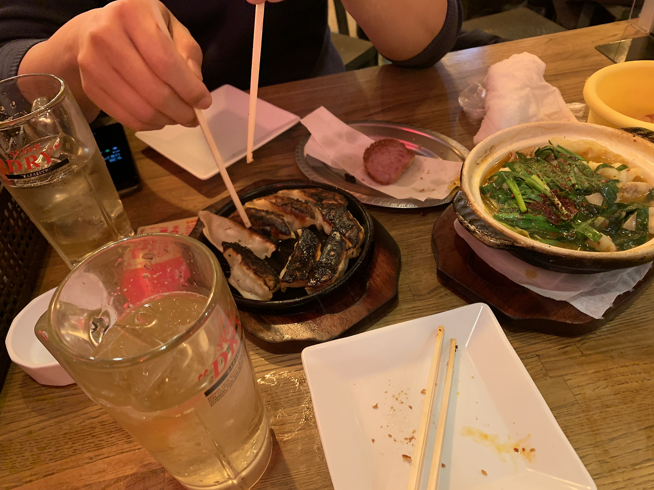 자리가 없어서 겨우겨우 착석했는데 너무 좁아서 불편했지만 또 일본의 이런 분위기는 일본이니깐 하며 모츠나베와 교자 그리고 햄카츠 주문했어요.