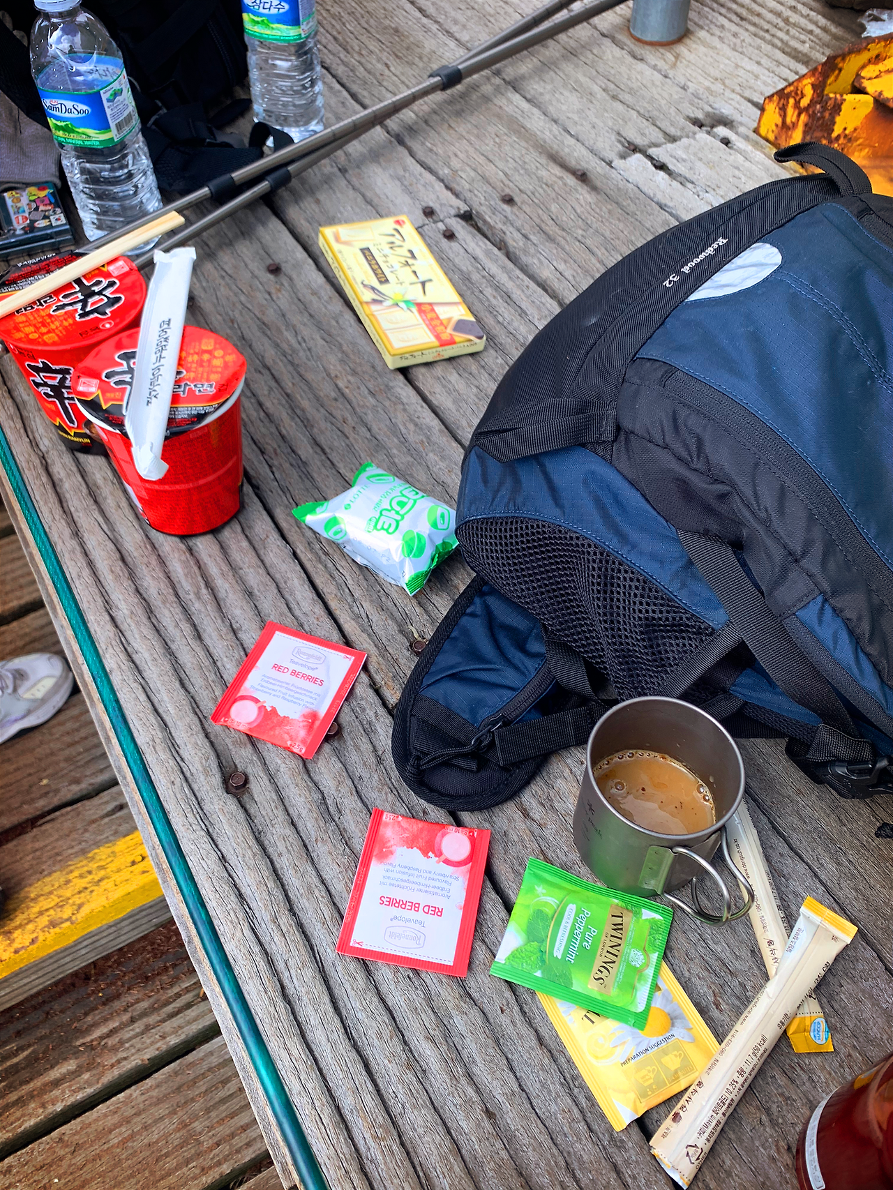 눈으로 인해서 여분의 양말을 준비했고 500ml 생수 2개와 보온물통에 뜨거운 물도 챙겼네요.