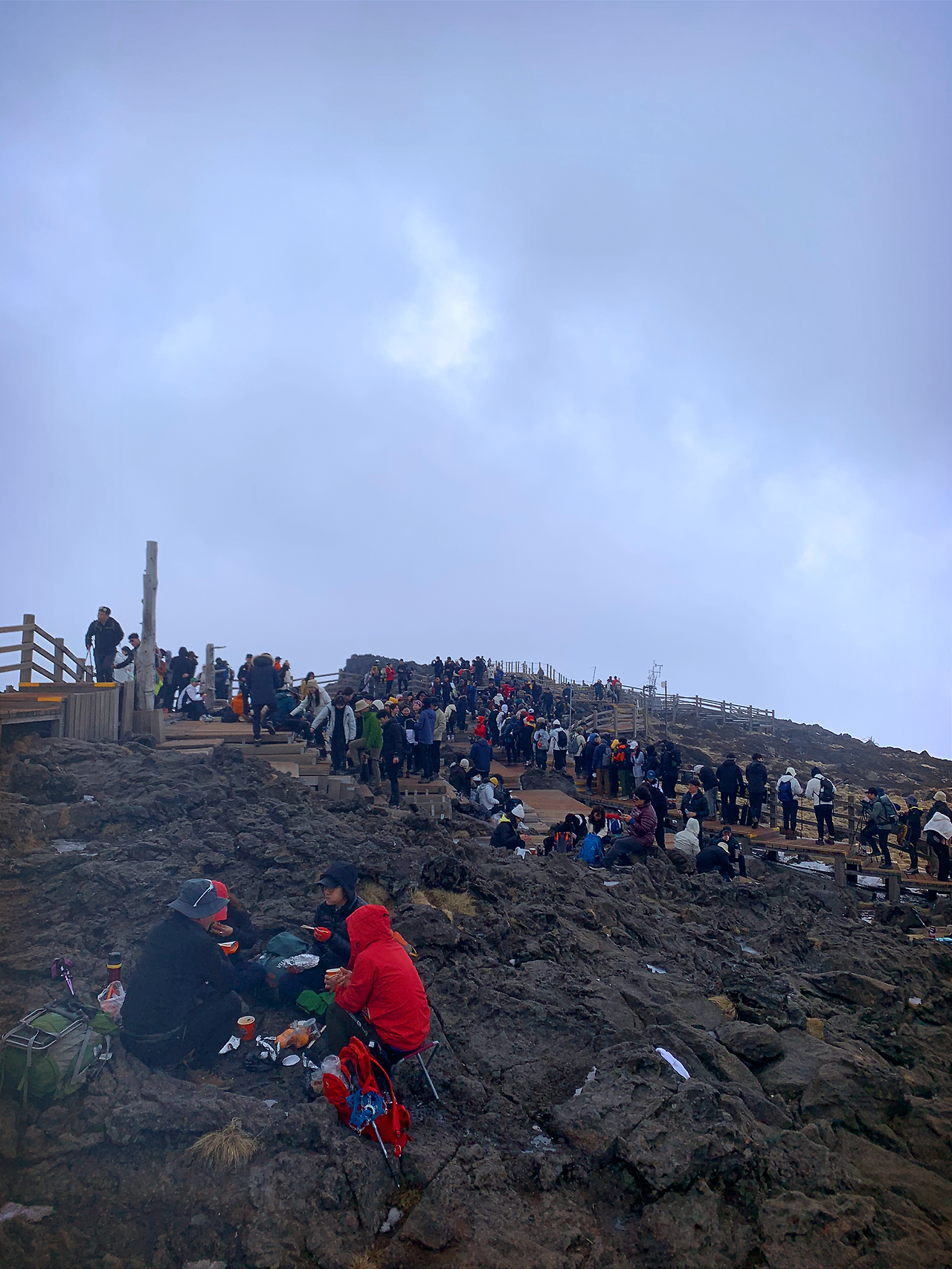 한라산 정상 비석에서 인증숏을 찍기 위해 늘어선 행렬로 저는 찍지는 못했어요.