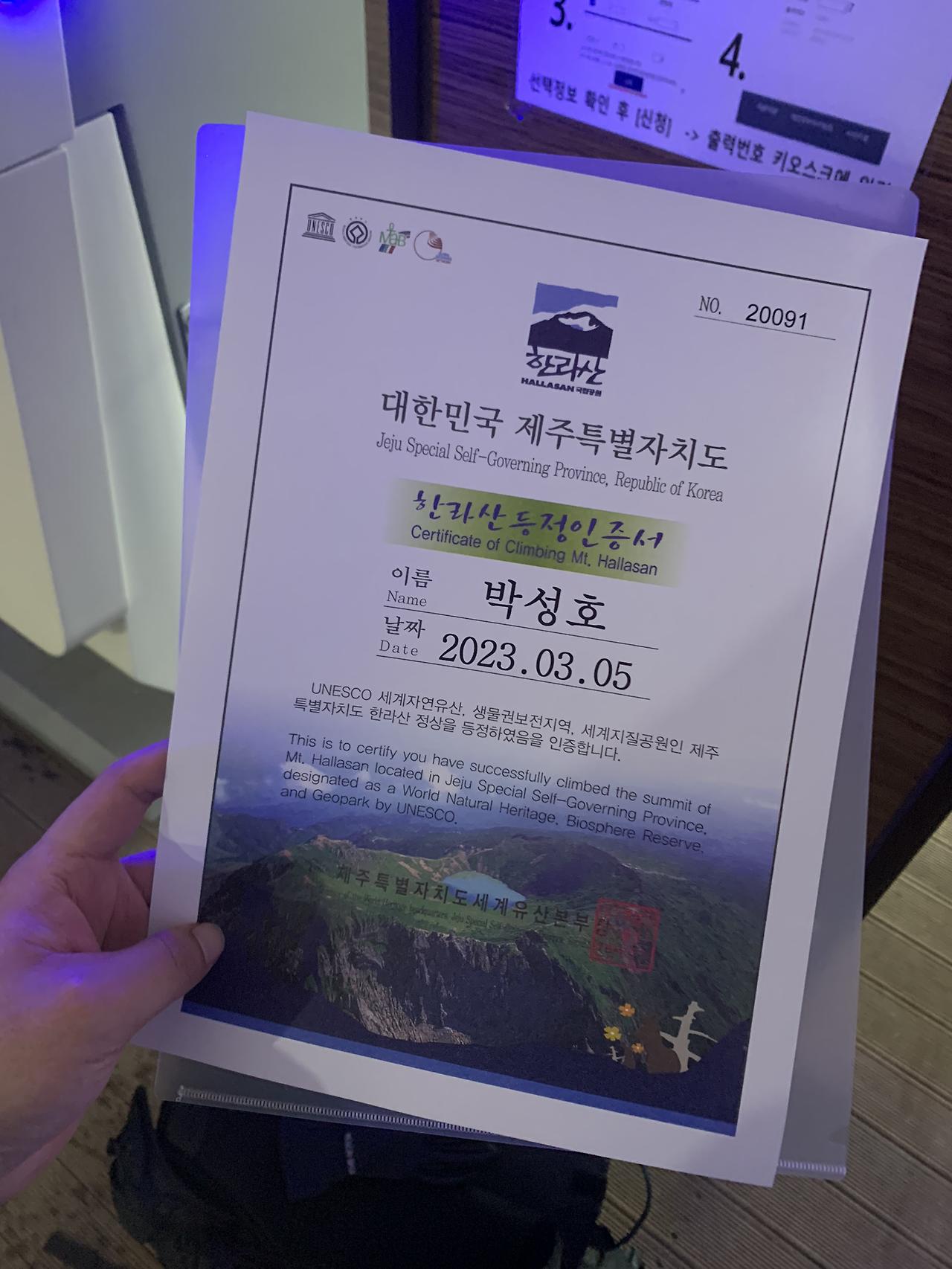 등정을 했으니 인증서도 받아야죠. 백록담에서 찍은 사진으로 인증을 하면 등산을 시작하는 곳에 키오스크가 있습니다.