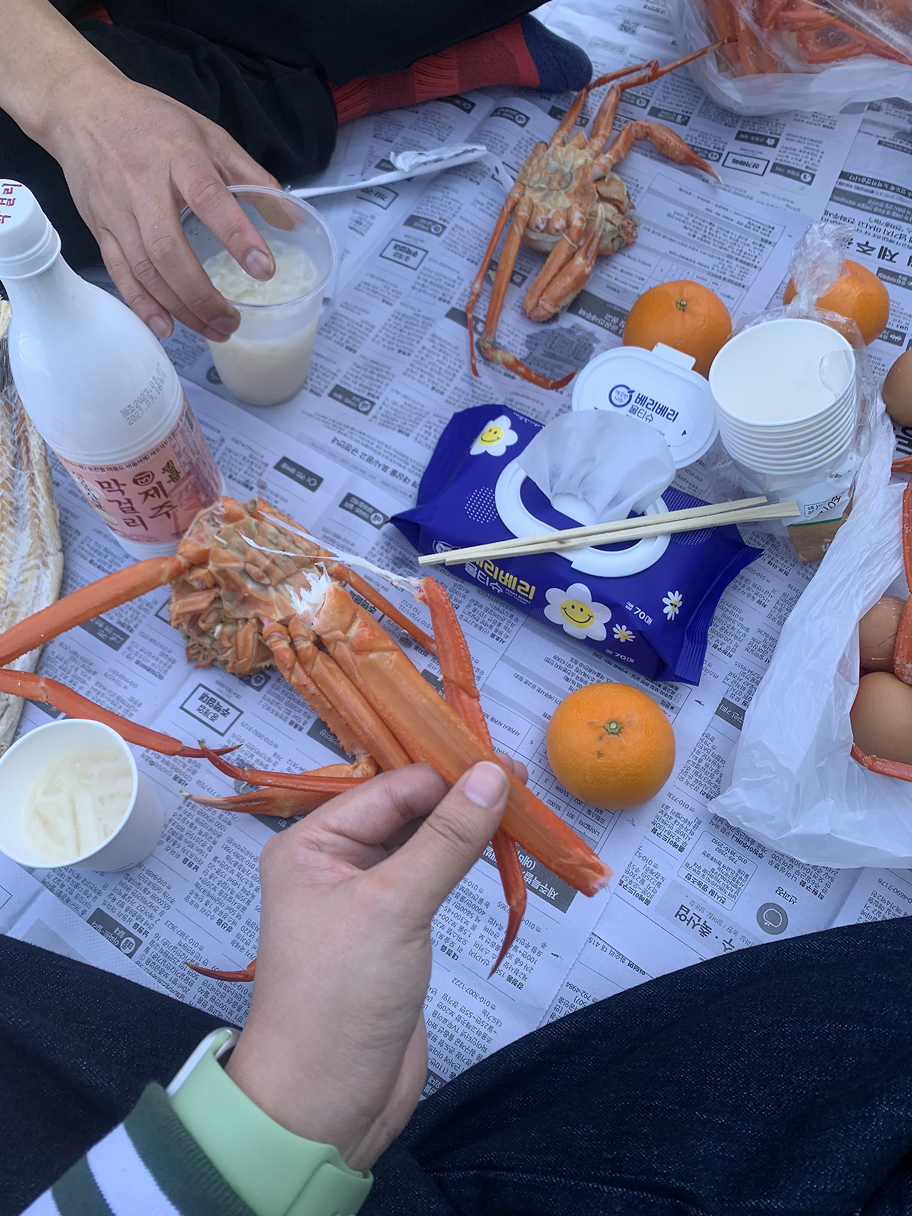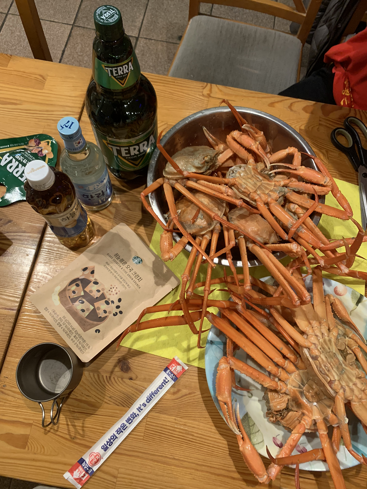 혼자 간단히 맥주 마시고 자려고 했는데 같은 방에 계신 형이 게를 어마어마하게 사 왔더라고요. 같이 먹자고 하셔서 저는 감사하게 예상치도 못하게 게를 먹게 되었네요.