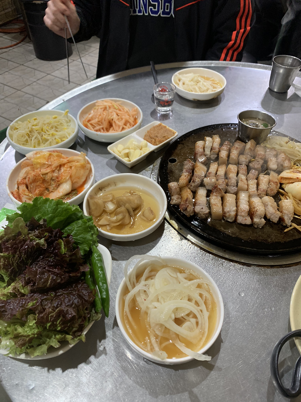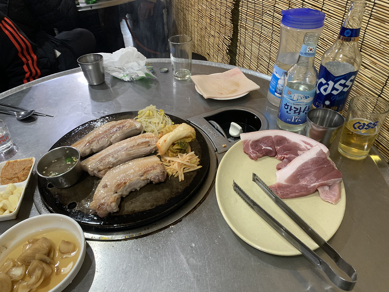 대신 나오는 찬이 그리 많지는 않은데 고기양이 정말 많아요. 요즘 비싸다던 청양고추도 나왔네요. 고기판에 무생채와 콩나물 그리고 김치를 함께 구우니 정말 맛있었습니다.