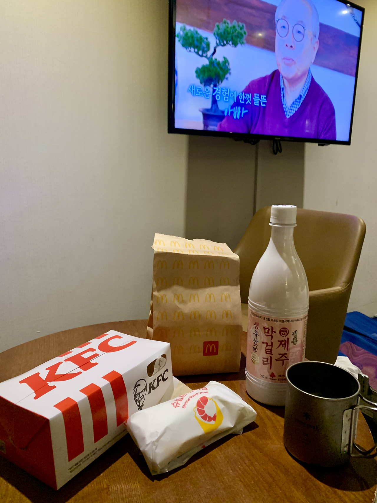 너무 피곤해서 저녁 먹고 한 시간 정도 자고 일어났는데 배가 고파서는 근처에 KFC와 맥도날드가 있어서 치킨과 새로 나온 슈림프스낵랩과 내 사랑 제주 생막걸리 사 왔어요.