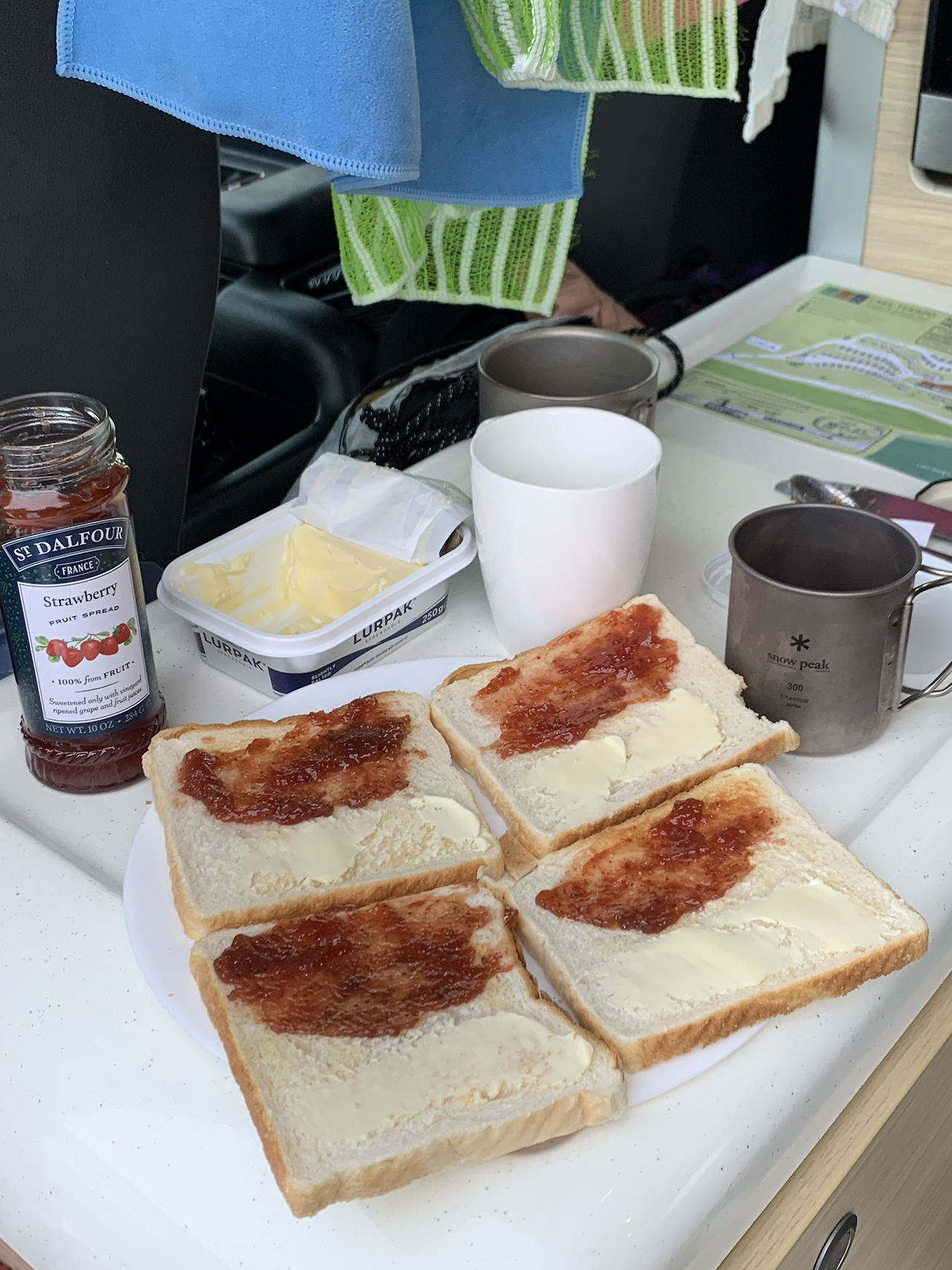 딸기잼에 버터에 따뜻한 커피와 차로 간단한 아침 즐기기