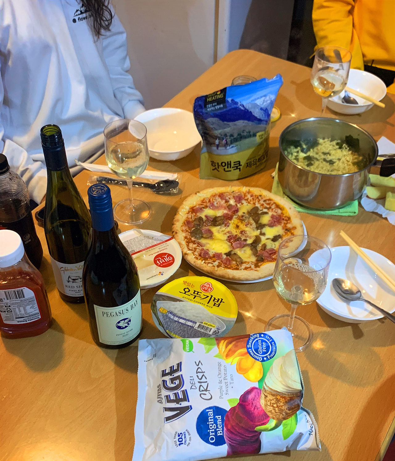 캠퍼밴에 있는 소스와 음료와 라면들도 오늘 다 정리를 해야해서 부실하지만 햇반도 라면도 냉동피자로 저녁을 마무리했습니다. 친구의 핫 앤 쿡이 빛을 발하는 순간.