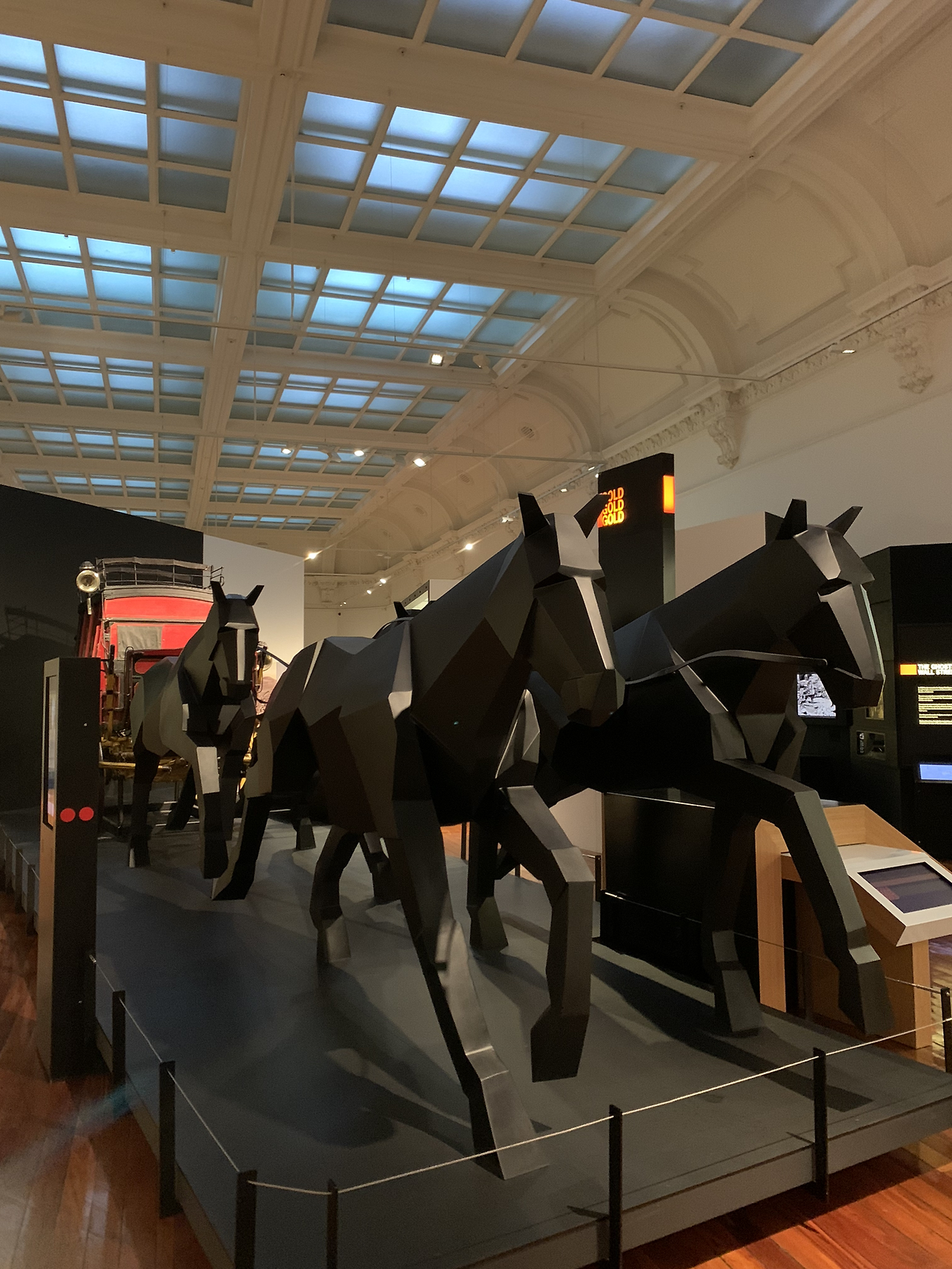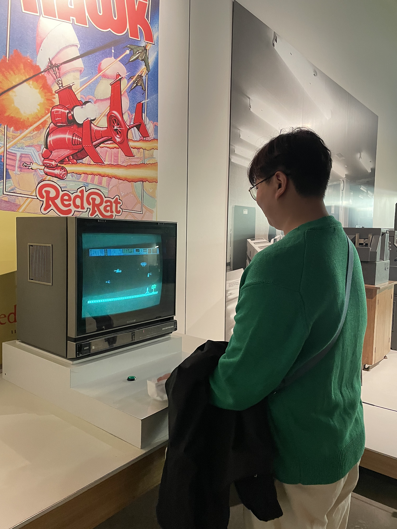 게임을 할 수도 있었고 시간의 순서대로 작품이 전시되어 있는데 마차를 시작해서 자동차와 증기기관차 그리고 컴퓨터가 등장하는 흐름이었어요.