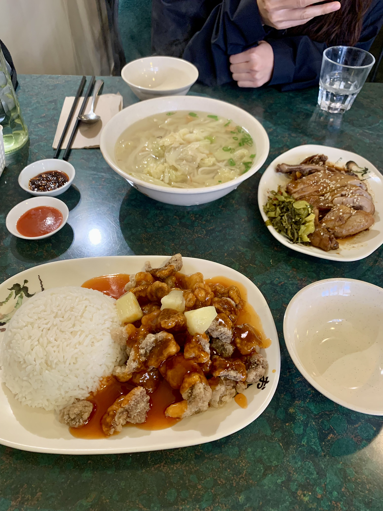 탕수육 같은 메뉴와 완탕누들과 오리고기 주문