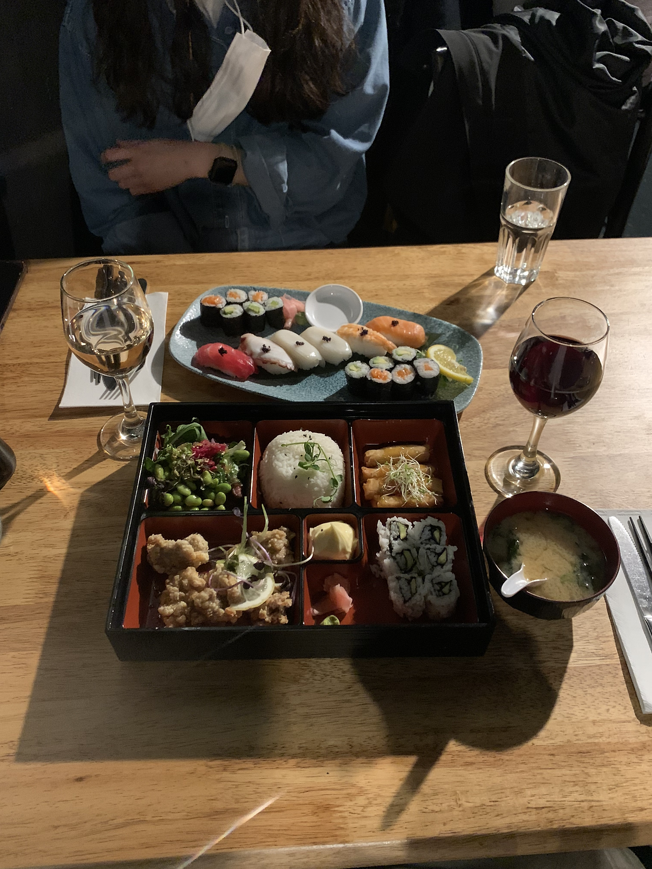 가라아게 도시락과 모둠초밥으로 주문했어요.