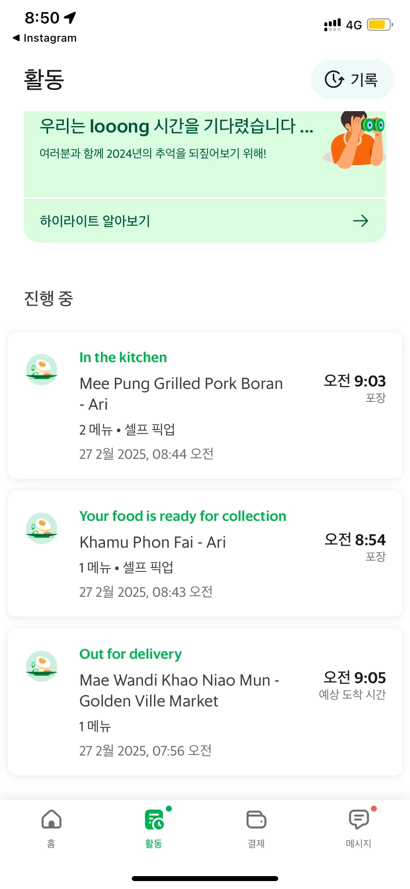 아침식사로 충분하지가 먹고 싶었던 메뉴들이 있어 그랩푸드로 음식을 주문했답니다.