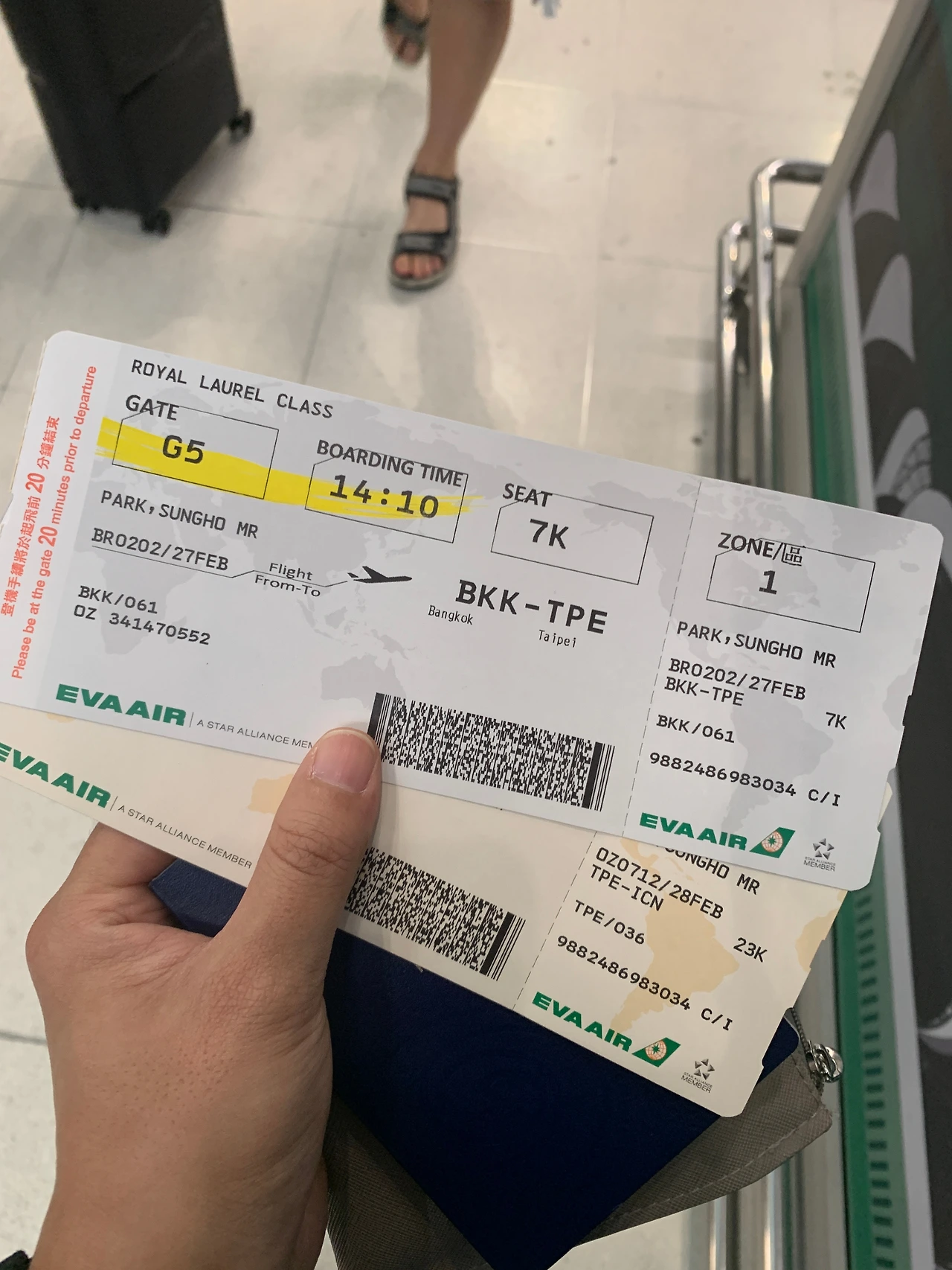 탑승권 두장을 받았답니다. 방콕에서 타이베이 그리고 타이베이에서 인천행까지