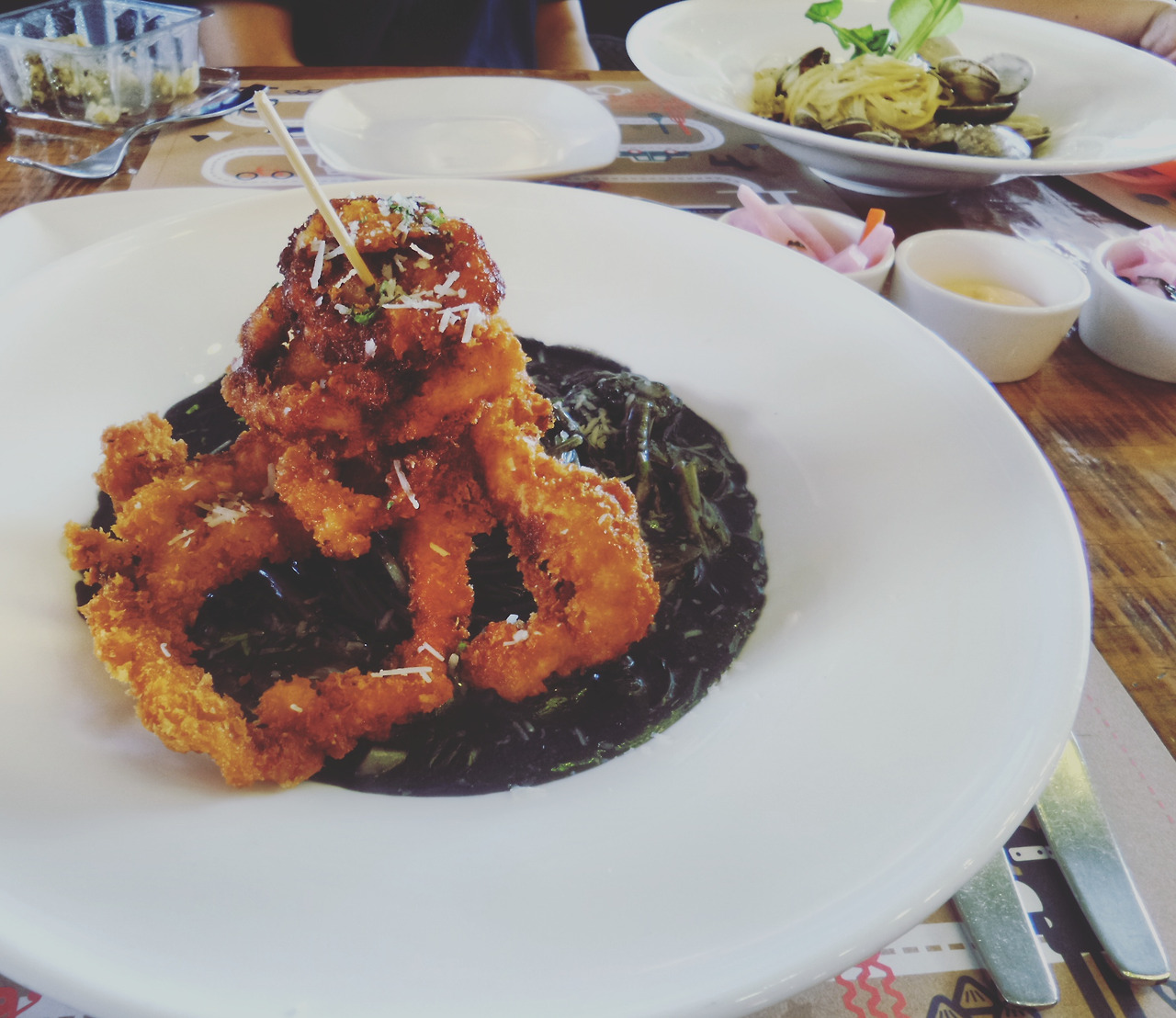 오징어튀김 먹물 파스타와 바질 페스토 파스타
