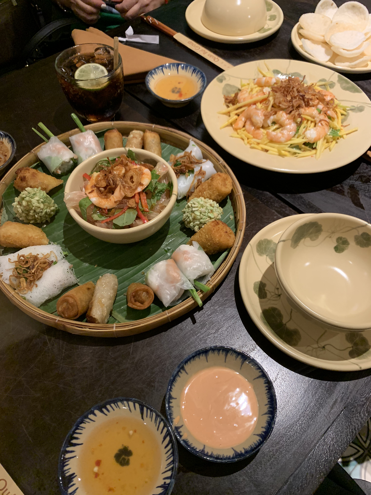 더 주문해서 먹은 것 같은데 포멜로가 들어간 샐러드와 여러 종류의 튀김과 쌈들이 이쁘게 나왔죠