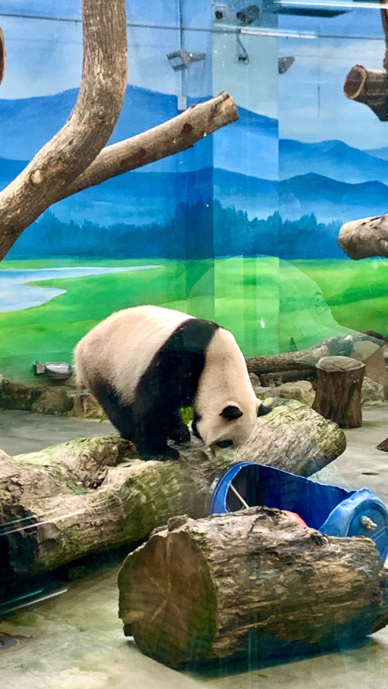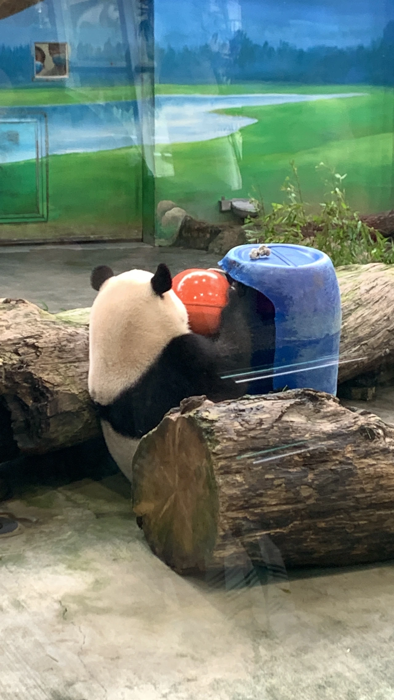 두 마리의 판다가 활발히 움직이고 통에 든 공으로 장난도 치고 너무너무 귀여웠어요.