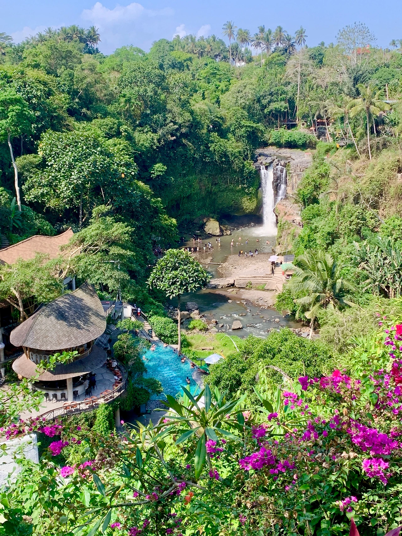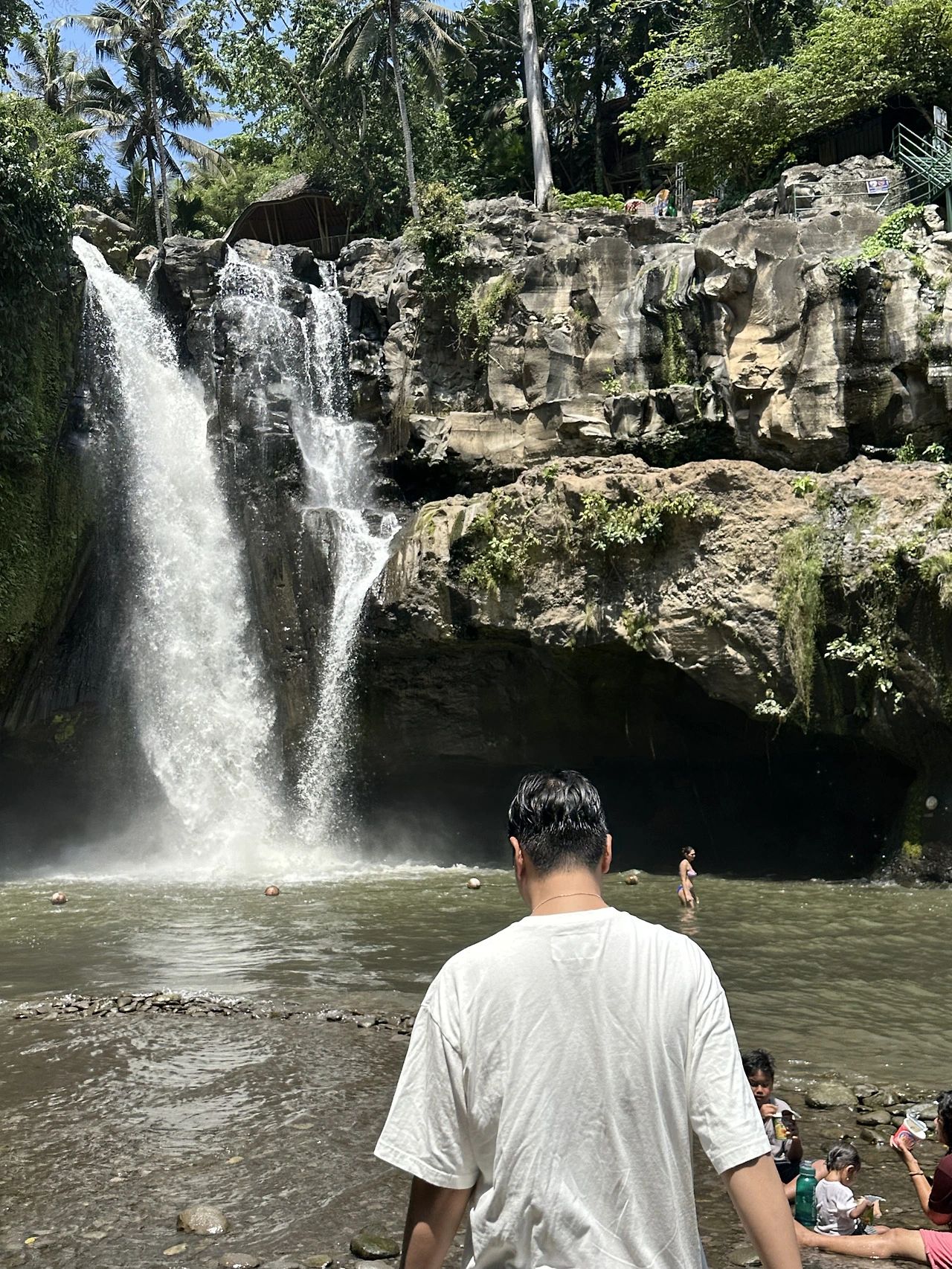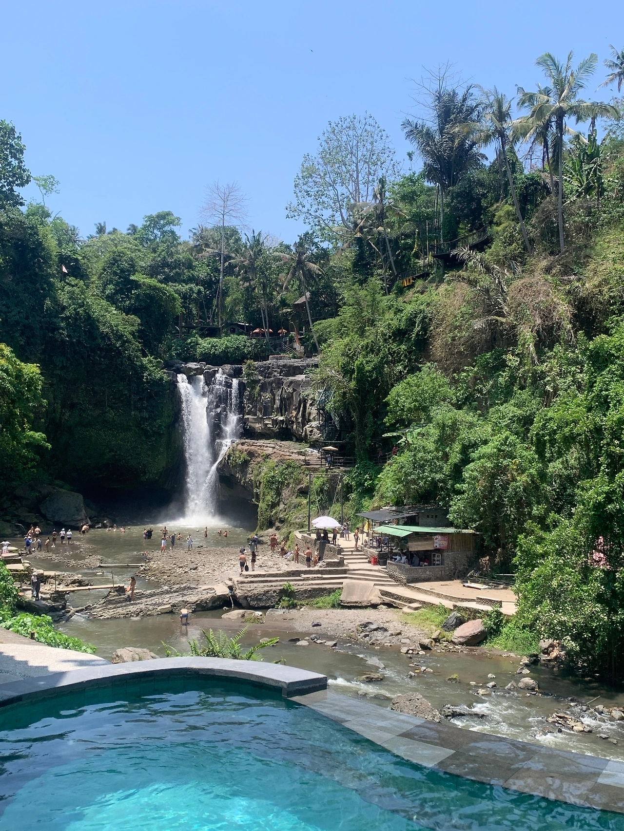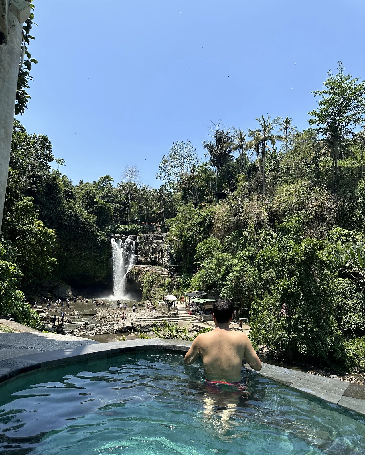 수영장에서 보이는 뜨그눙안 폭포가 장관이죠. 폭포를 즐기는 분들도 많아요.