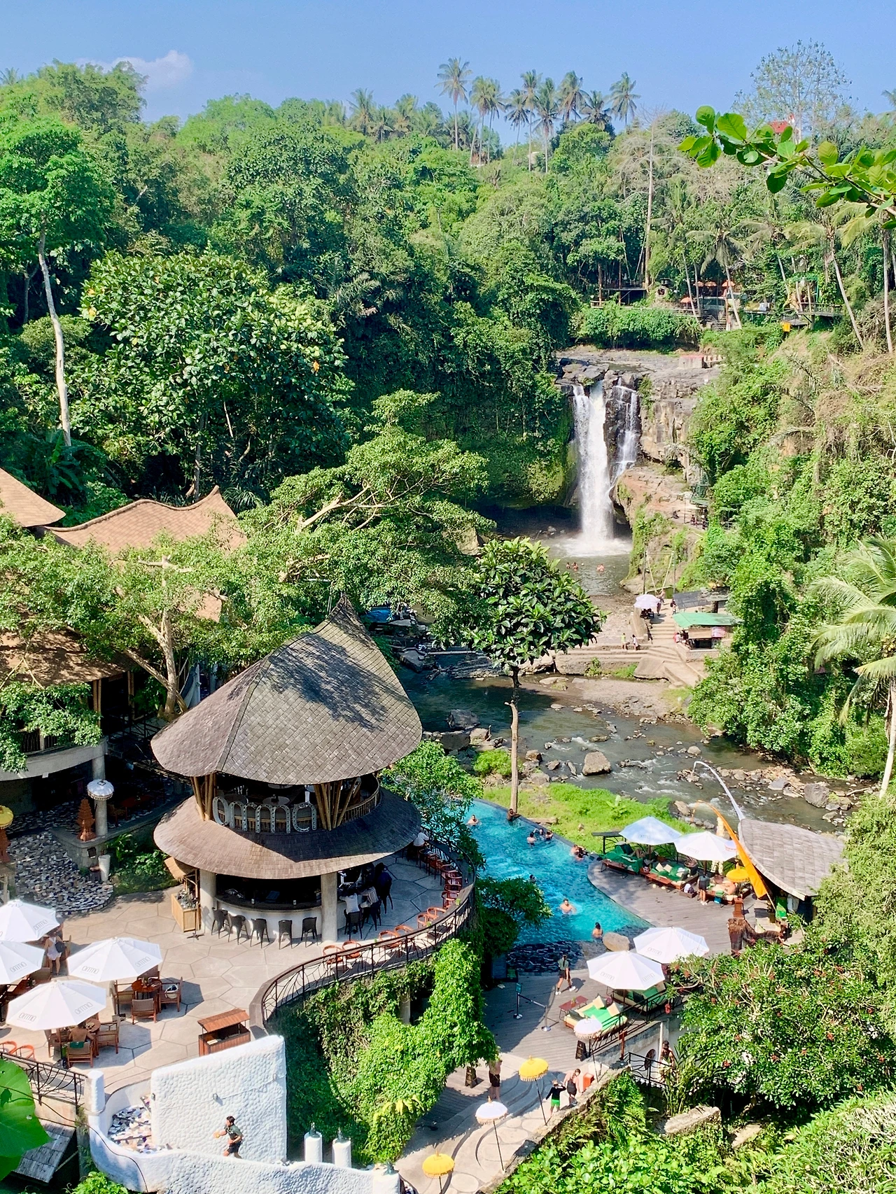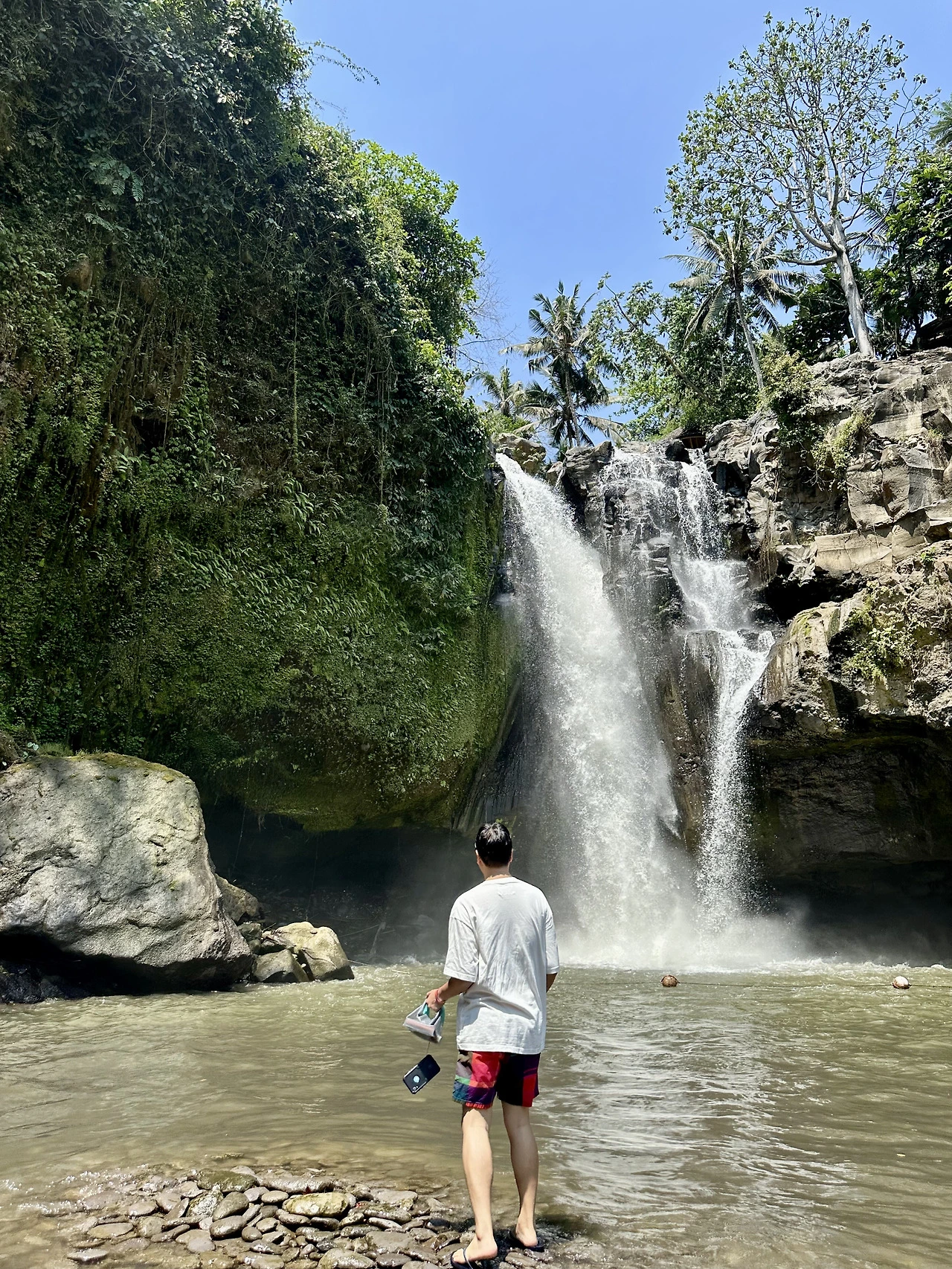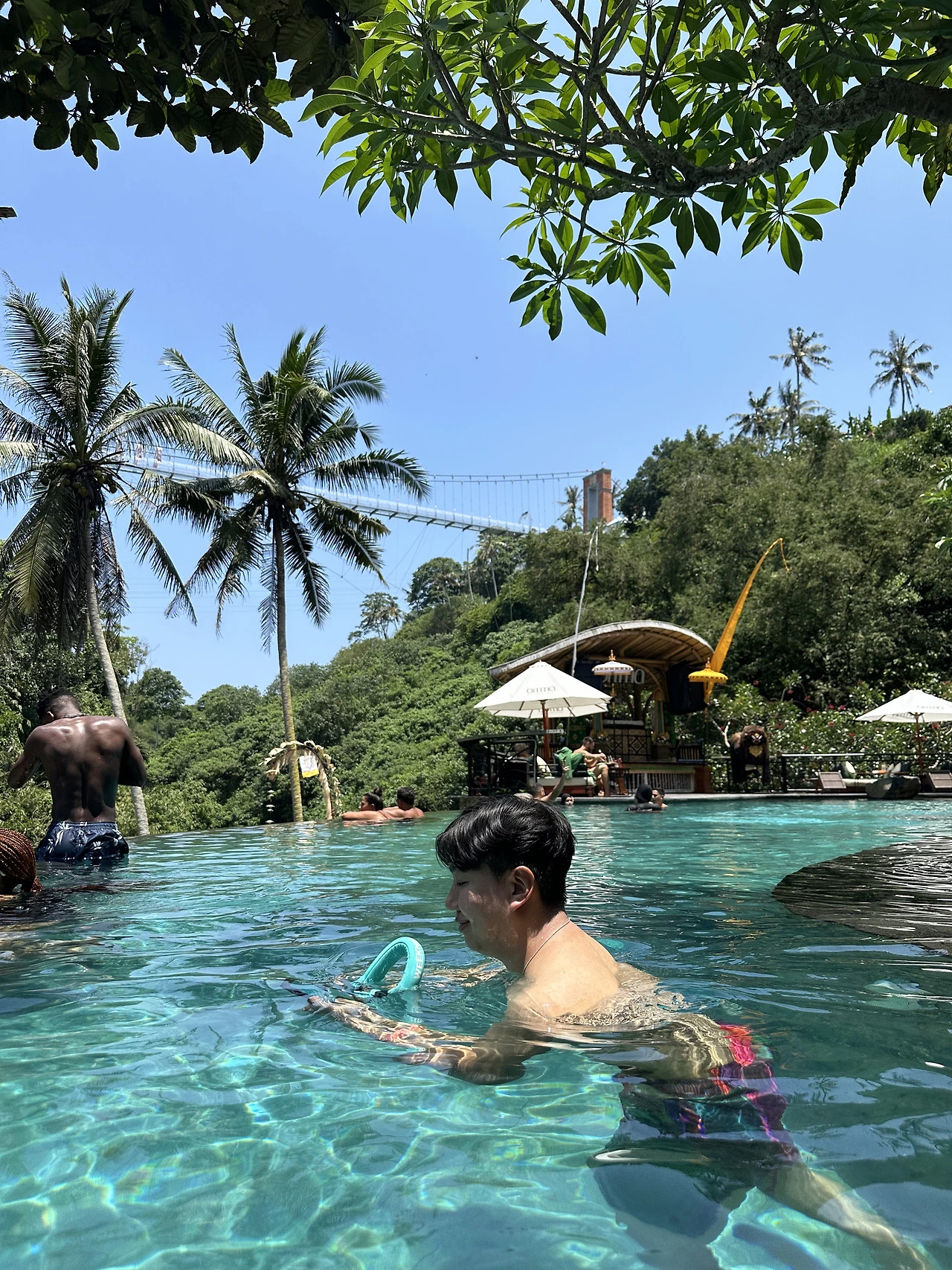 수영장에서 보이는 뜨그눙안 폭포가 장관이죠. 폭포를 즐기는 분들도 많아요.
