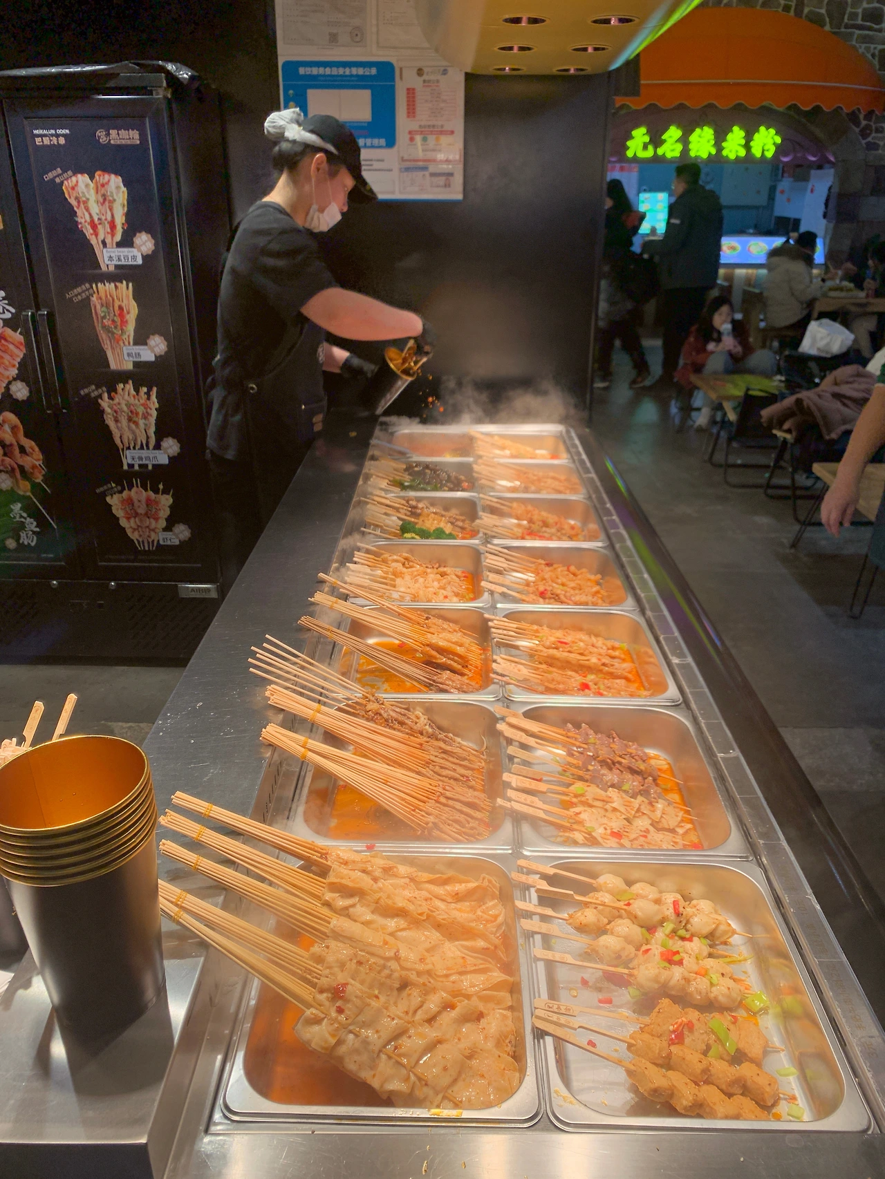 숙소로 돌아가려는데 지하에 푸드코드에 수많은 메뉴들을 판매하고 있어서 차가운 훠궈꼬치를 먹고 싶은 거 골라서 주문했어요.