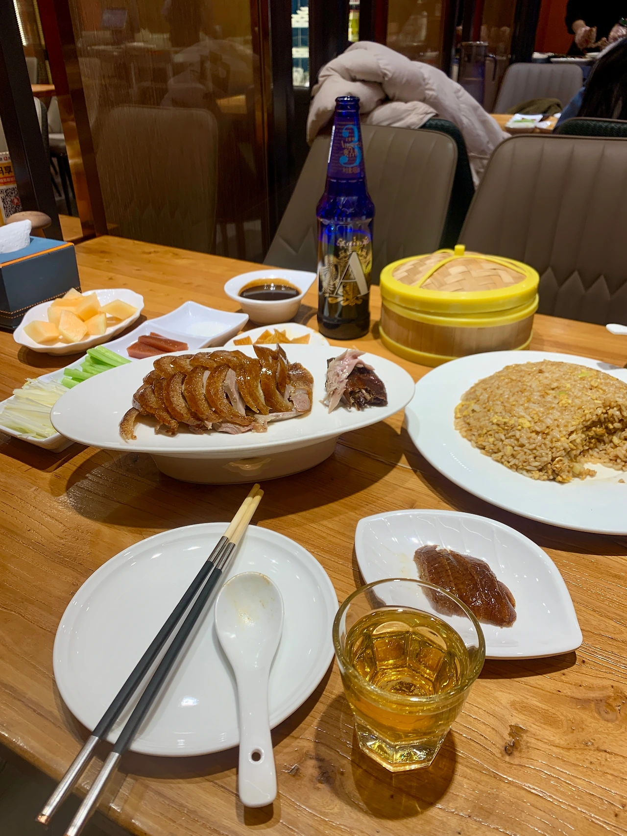 베이징덕도 껍질을 설탕에 찍어먹고 전병에 잘 말아서 먹었어요. 볶음밥은 양이 너무 많아서 덜어서 먹고 포장